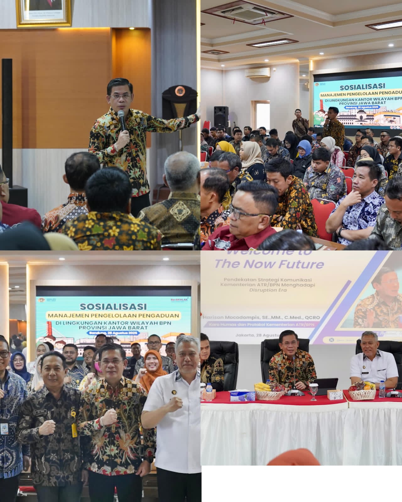 Kepala Biro Hubungan Masyarakat (Humas) dan Protokol Kementerian Agraria dan Tata Ruang/Badan Pertanahan Nasional (ATR/BPN), Harison Mocodompis, menilai komunikasi publik jadi hal penting yang bisa menekan tingginya pengaduan masyarakat. Hal ini ia sampaikan saat menjadi narasumber dalam Sosialisasi Manajemen Pengelolaan Pengaduan di lingkungan Kantor Wilayah (Kanwil) BPN Provinsi Jawa Barat, Kamis (28/08/2025).
