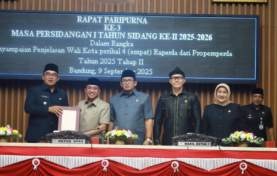 DPRD Kota Bandung menerima empat usulan Raperda dari Propemperda Tahun 2025 Tahap II, dalam rapat paripurna yang digelar Selasa, 9 September 2025. Rapat paripurna ini dipimpin oleh Ketua DPRD Kota Bandung H. Asep Mulyadi, S.H., didampingi Wakil Ketua I DPRD Kota Bandung H. Toni Wijaya, S.E., S.H., Wakil Ketua II Dr. H. Edwin Senjaya, S.E., M.M., Wakil Ketua III Rieke Suryaningsih, S.H., serta dihadiri para Anggota DPRD Kota Bandung. Hadir dalam rapat paripurna itu, Wali Kota Bandung Muhammad Farhan, Sekda Kota Bandung Iskandar Zulkarnain, serta jajaran pimpinan OPD.