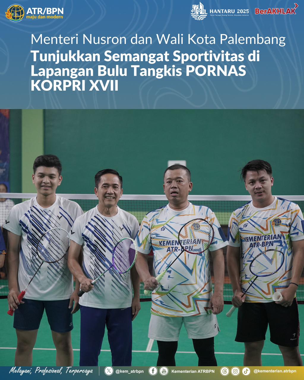 Suasana penuh semangat dan keakraban menyelimuti pertandingan ekshibisi bulu tangkis antara Menteri Agraria dan Tata Ruang/Kepala Badan Pertanahan Nasional (ATR/BPN), Nusron Wahid, yang berpasangan dengan Azhar Erfanda, melawan Wali Kota Palembang, Ratu Dewa, yang berpasangan dengan M. Adri Al Afuw. Laga persahabatan ini digelar untuk memeriahkan Pekan Olahraga Nasional Korps Pegawai Republik Indonesia (PORNAS KORPRI) yang ke-XVII Tahun 2025, di Kebon Gede Badminton Arena, Kota Palembang.