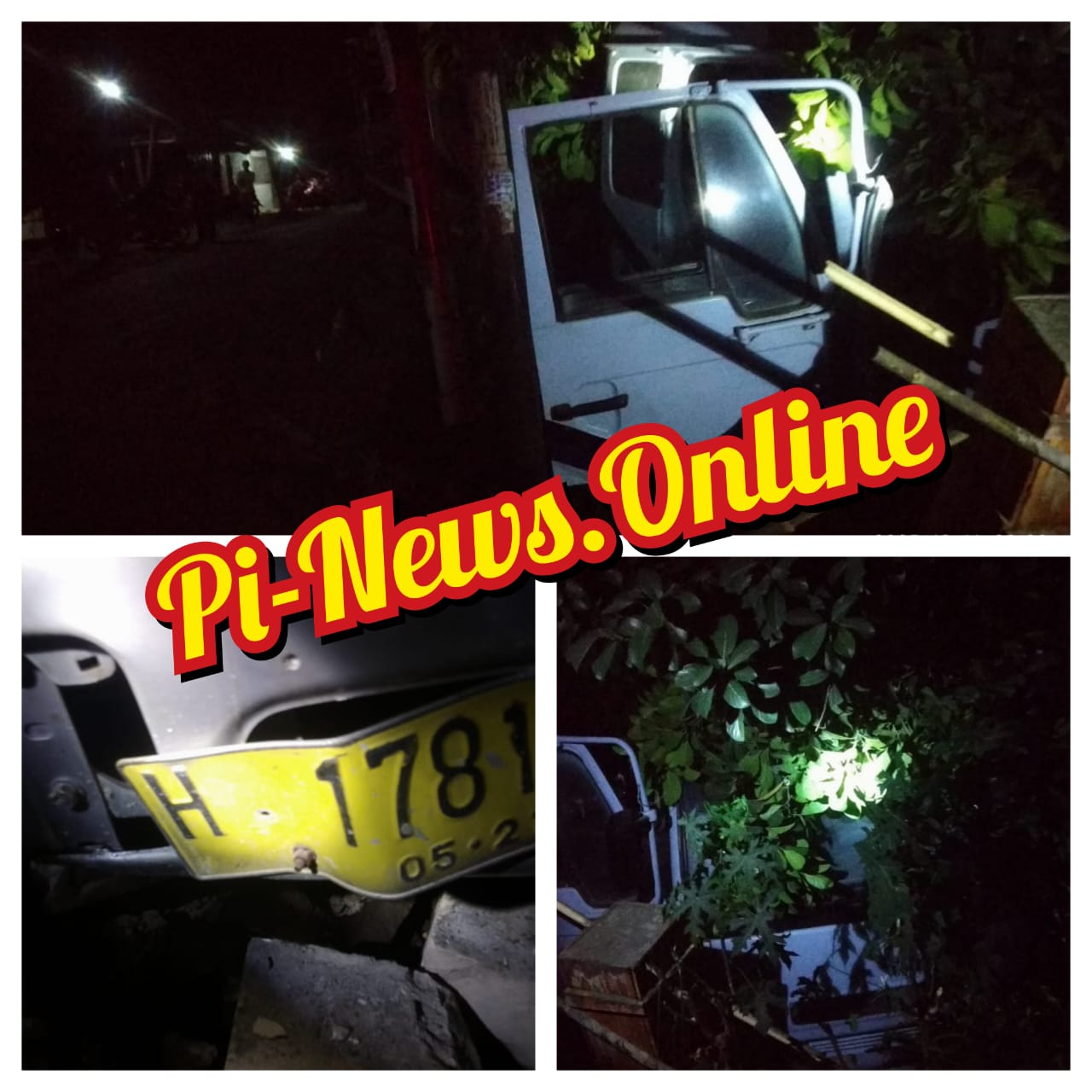 Tampak kondisi kendaraan truk tersebut nyungsep ke kiri jalan masuk halaman rumah warga.
