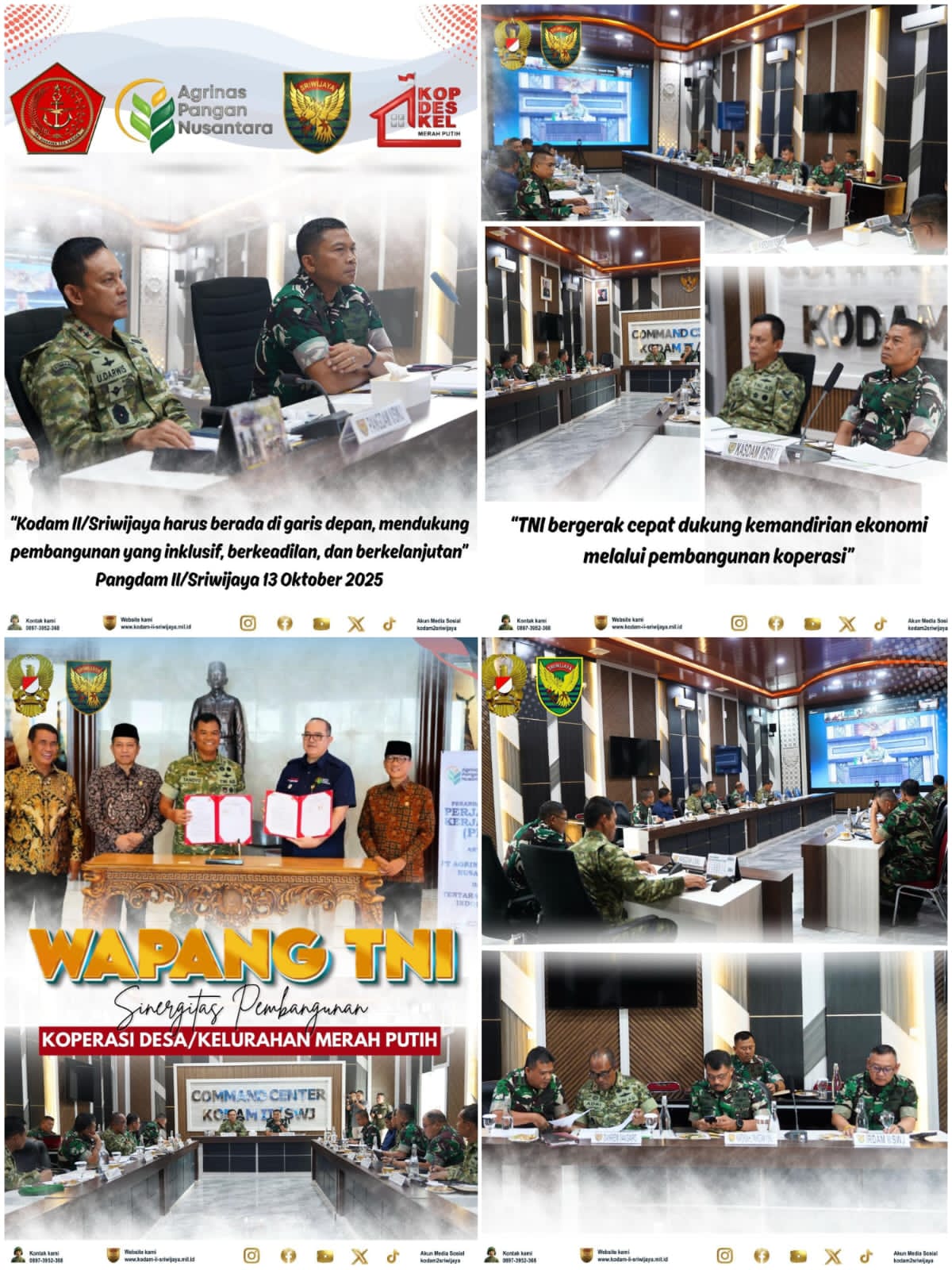Panglima Komando Daerah Militer (Pangdam) II/Sriwijaya Mayor Jenderal TNI Ujang Darwis, M.D.A., mengikuti rapat koordinasi tindak lanjut Perjanjian Kerja Sama (PKS) antara Tentara Nasional Indonesia (TNI) dan PT Agrinas Pangan Nusantara (Persero) terkait pembangunan Koperasi Desa/Kelurahan Merah Putih (KDKMP). Rapat digelar melalui video konferensi dari Gedung Pusat Komando dan Pengendalian Operasi Kodam II/Sriwijaya, Senin (13/10/2025), dan dipimpin oleh Wakil Panglima TNI Jenderal TNI Tandyo Budi Revita.