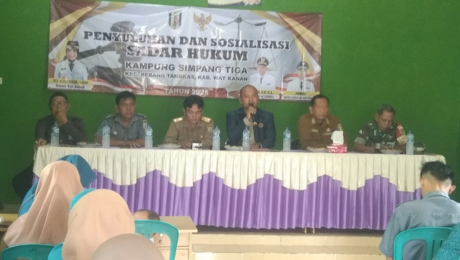 Pemerintahan Kampung Simpang Tiga, Kecamatan Rebang Tangkas, Kabupaten Way Kanan menggelar kegiatan penyuluhan dan sosialisasi sadar hukum di Balai Kampung Simpang Tiga.