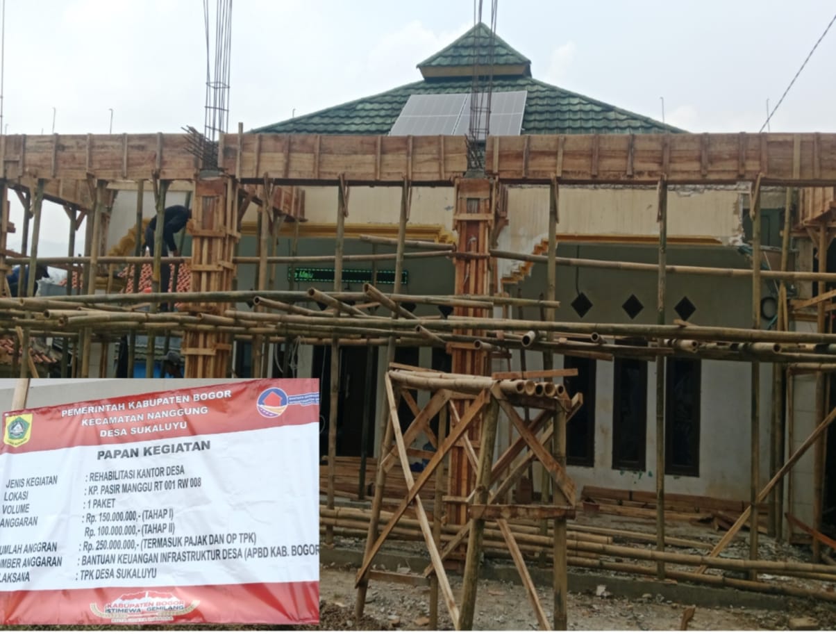 Pemerintah Desa (Pemdes) Sukaluyu, Kecamatan Nanggung, Kabupaten Bogor, Jawa Barata, realisasikan program Bantuan Keuangan Infrastruktur Desa ( BKID ) untuk pembangunan Rehabilitasi Kantor Desa , yang berlokasi di Kampung Pasir Manggu RT 001 RW 008, dengan Volume 1 Paket, dengan nilai anggaran sebesar Rp 250.000.000; ( Termasuk Pajak ) yang di kerjakan oleh Tim Pelaksana Kegiatan (TPK) dan masyarakat