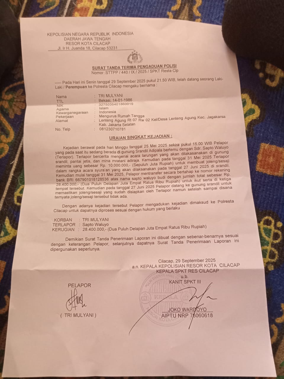 Dalam uraian singkat kejadian sebagaimana tercatat di Surat Tanda Terima Laporan Polisi dengan Nomor : STTPP/440/IX/2025/SPKT Resta Clp dinyatakan bahwa laporan itu dipicu akibat dirinya merasa dirugikan sebesar rp.28.400.000 (dua puluh delapan juta, empat ratus ribu rupiah) oleh Terlapor sehubungan dana tersebut mestinya dialokasikan membuat “JOLENG/SESAJI LARUNGAN di tiga tempat (Gunung srandil, Jetis dan Mina mratani-adiraja)”., namun ternyata tatkala tiba saatnya dibutuhkan Joleng/sesaji tersebut tidak ada.