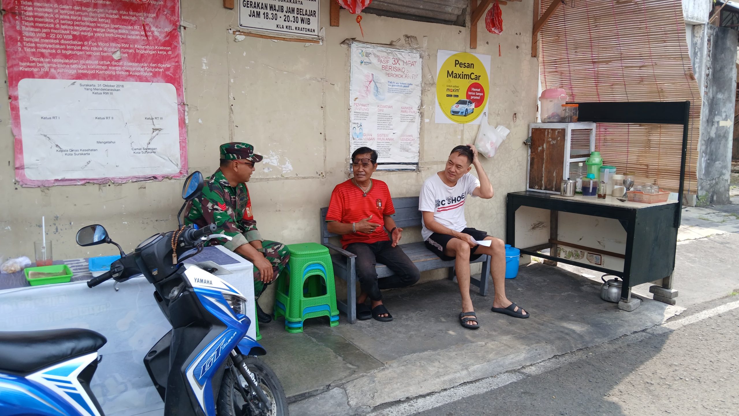 Babinsa Kratonan Koramil 03/Serengan Kodim 0735/Surakarta Koptu Resbiyanto Pukul 08.30 wib melaksanakan Kegiatan Komunikasi Sosial dengan Bapak Budi Raharjo selalu etua Rt. 2/3 dan Bapak Aryo Ketua Rt. 4/3 di Liya Snack Jl. Manduro No. 26 Kratonan Serengan Kota Surakarta. (19/10/2025)