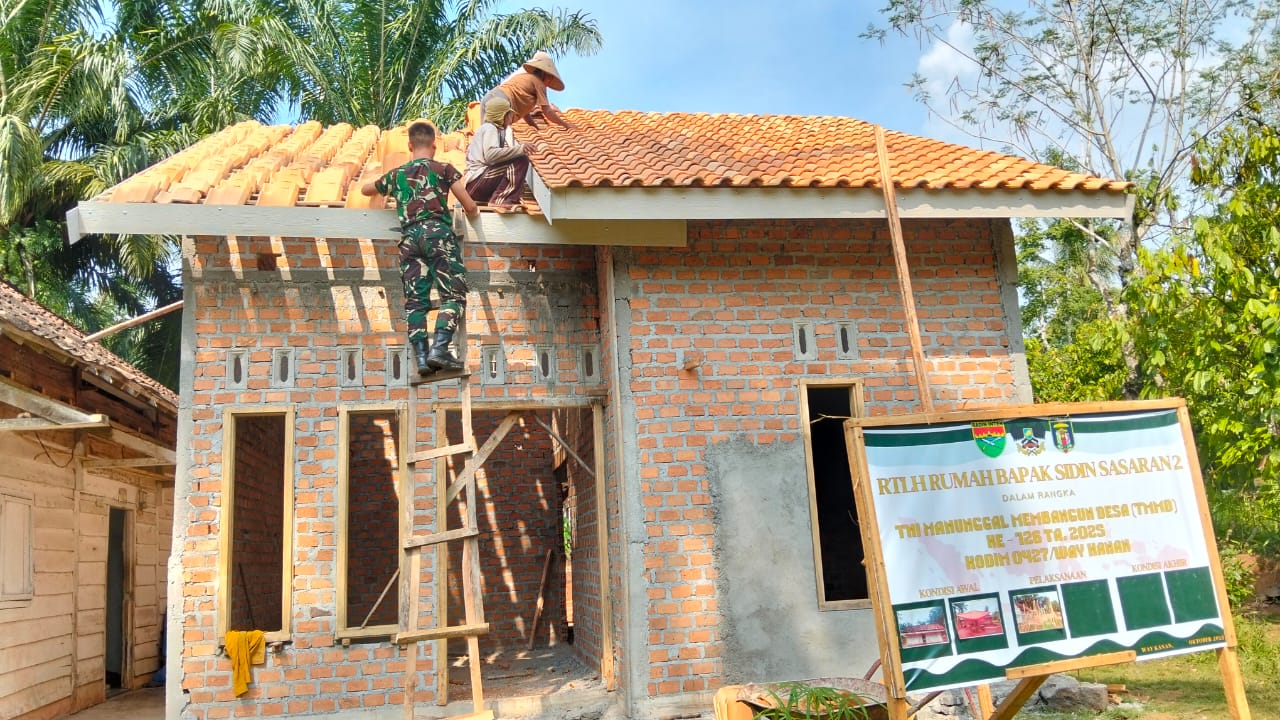 Pengerjaan RTLH Rumah Bapak Sidin Capai 70 Persen, Satgas TMMD ke-126 Kodim 0427/Way Kanan Lanjutkan Tahap Pemasangan Genteng