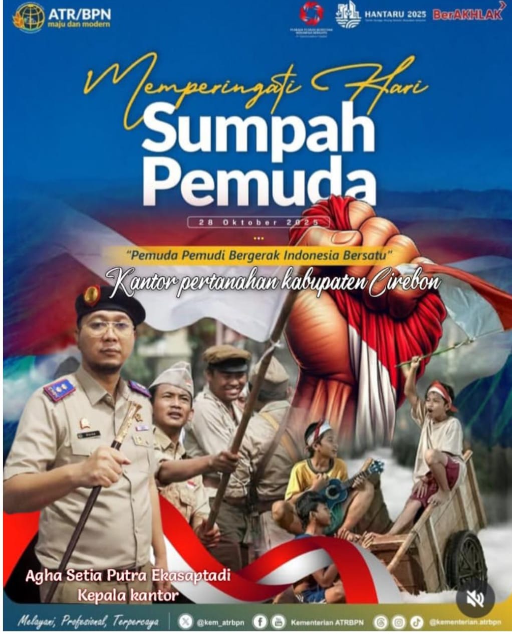 Kantor pertanahan kabupaten Cirebon Mengucapkan selamat hari sumpah pemuda 28 Oktober 2025 adminOktober 28, 20253 Dilihat Print 🖨 PDF 📄Kantor pertanahan kabupaten Cirebon Mengucapkan selamat hari sumpah pemuda 28 Oktober 2025 Post Views: 3 Pos terkaitSetahun Menteri Nusron: 96 Persen Penertiban Tanah Telantar Dialokasikan untuk Reforma AgrariaPeringati Hari Sumpah Pemuda ke – 97 Lapas Way Kanan Laksanakan Upacara BenderaUpacara Hari Sumpah Pemuda Tahun 2025: Wakapolres Way Kanan Bangkitkan Semangat Pemuda Patriotik, Gigih dan Empati*Letda Inf Harmanizar Bersama Anggota Latih Anak-Anak Bermain Bulu Tangkis di Kampung SriwijayaKreasi dan kreativitas kinerja kepsek sman12 kota Bandung diwujudkan dengan kinerja yang penuh tanggung jawabKAJATI JABAR LANTIK 25 PEJABAT BARU DI WILAYAH KEJAKSAAN TINGGI JAWA BARAT