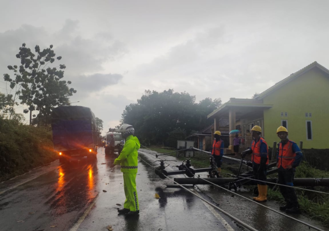 Aksi cepat tanggap dilakukan Satlantas Polres Way Kanan mengevakuasi tiang listrik milik perusahaan listrik negara (PLN) tumbang yang menutupi sebagian badan jalan Lintas Tengah Sumatera (Jalinsum) Kampung Suka Negeri Kecamatan Gunung labuhan Kabupaten Way Kanan. Selasa (4/11/2025).