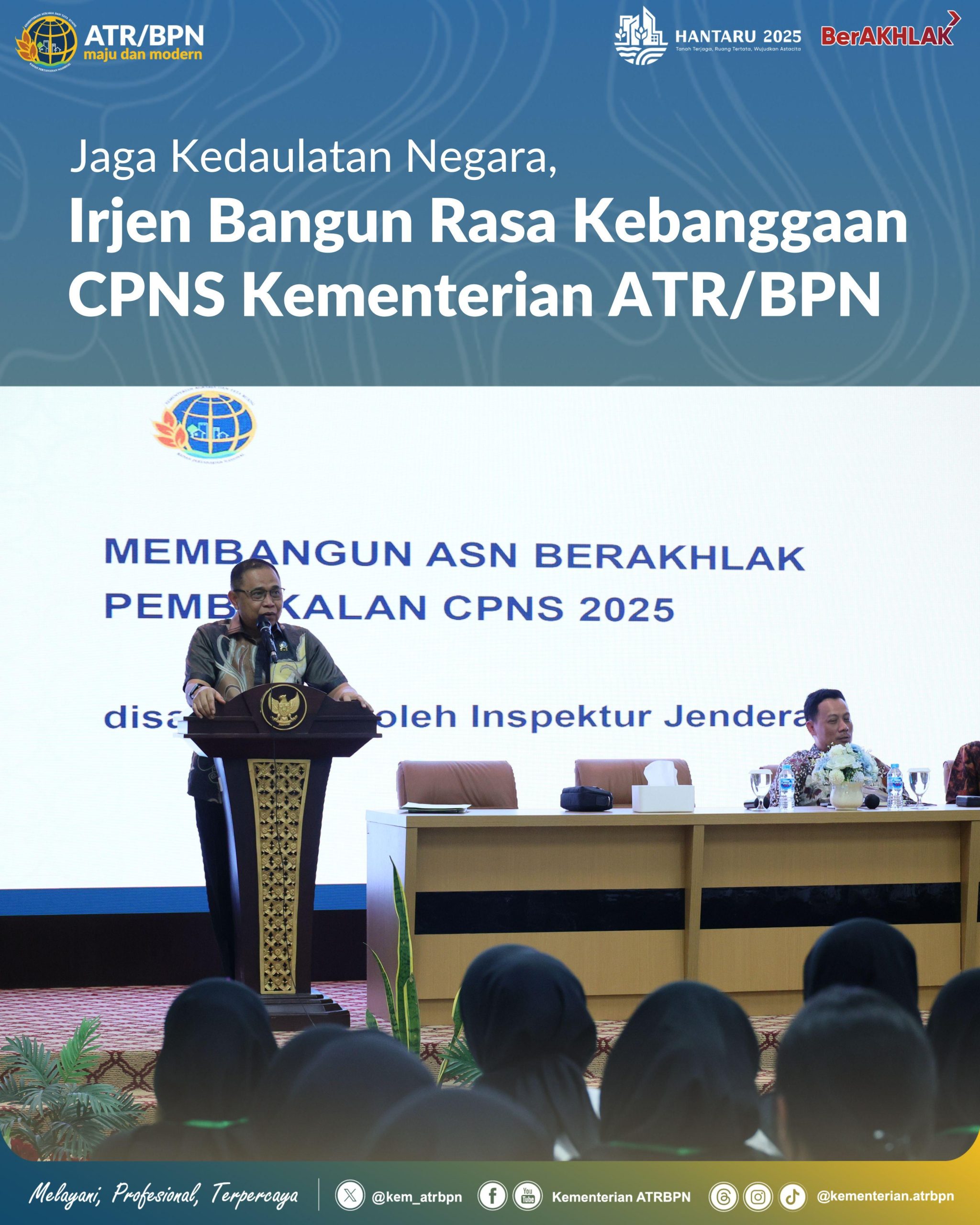 Inspektur Jenderal (Irjen) Kementerian Agraria dan Tata Ruang/Badan Pertanahan Nasional (ATR/BPN), Pudji Prasetijanto Hadi, menanamkan semangat kebanggaan dan tanggung jawab kepada para peserta Pelatihan Dasar Calon Pegawai Negeri Sipil (CPNS) Kementerian ATR/BPN. Rasa bangga itu berdasar dari peran strategis Kementerian ATR/BPN dalam menegakkan kedaulatan Indonesia.