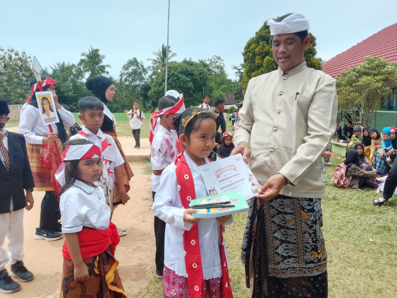 Ka UPT Nyoman berpesan, agar Anak yang mendapatkan hadiah alat tulis dan piagam dengan tema pahlawan teladanku, terus bergerak Melanjutkan Perjuangan.