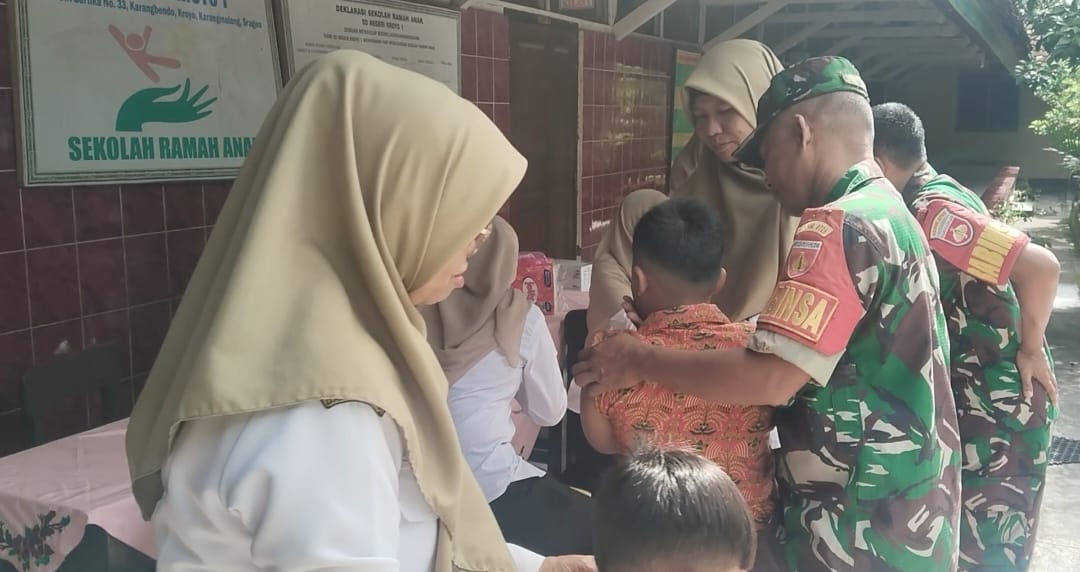 Dalam rangka mendukung Kesehatan anak, Serka Sugito Babinsa Kel. Kroyo bersama dua orang anggota Koramil 02/Karangmalang Kodim 0725/Sragen turut hadir dalam kegiatan Imunisasi Bulan Imunisasi Anak Sekolah (BIAS) yang dilaksanakan di SDN 1 Kroyo, Kecamatan Karangmalang. Kehadiran Serka Sugito tersebut bertujuan memberikan dukungan dan membantu kelancaran kegiatan imunisasi yang dilakukan oleh petugas kesehatan Puskesmas Karangmalang, Kamis (13/11/2025).