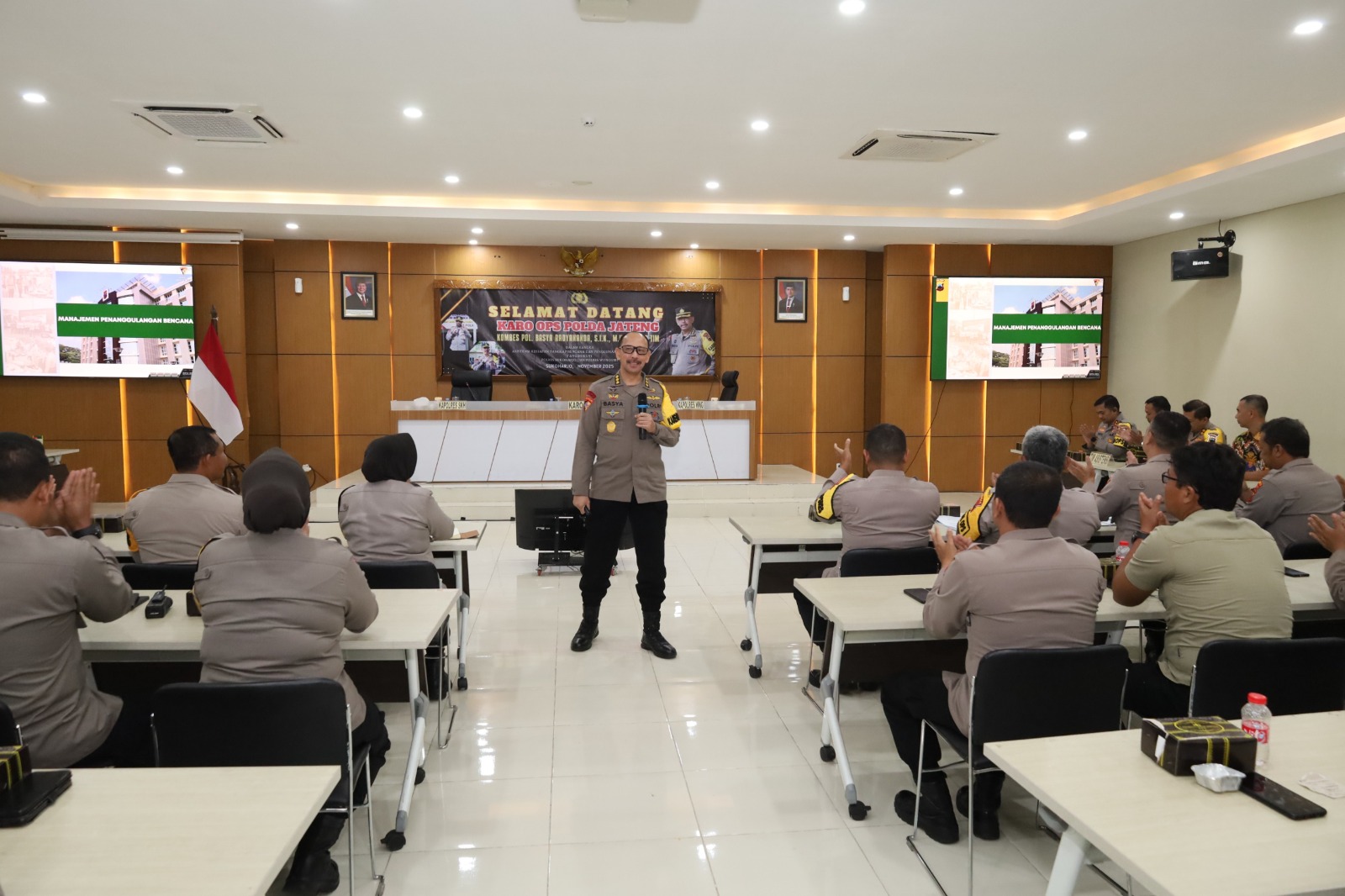Upaya memperkuat kesiapsiagaan bencana di lingkungan Kepolisian kembali digencarkan melalui asistensi yang dipimpin Karo Ops Polda Jateng Kombes Pol Basya Radyananda, S.I.K., M.H., Selasa (18/11), di Mapolres Sukoharjo. Kegiatan yang berlangsung sejak pukul 14.50 hingga 18.50 WIB tersebut diikuti jajaran Polres Sukoharjo dan Polres Wonogiri, sekaligus menjadi momentum bagi anggota untuk menyamakan persepsi dan meningkatkan kompetensi menghadapi potensi bencana.