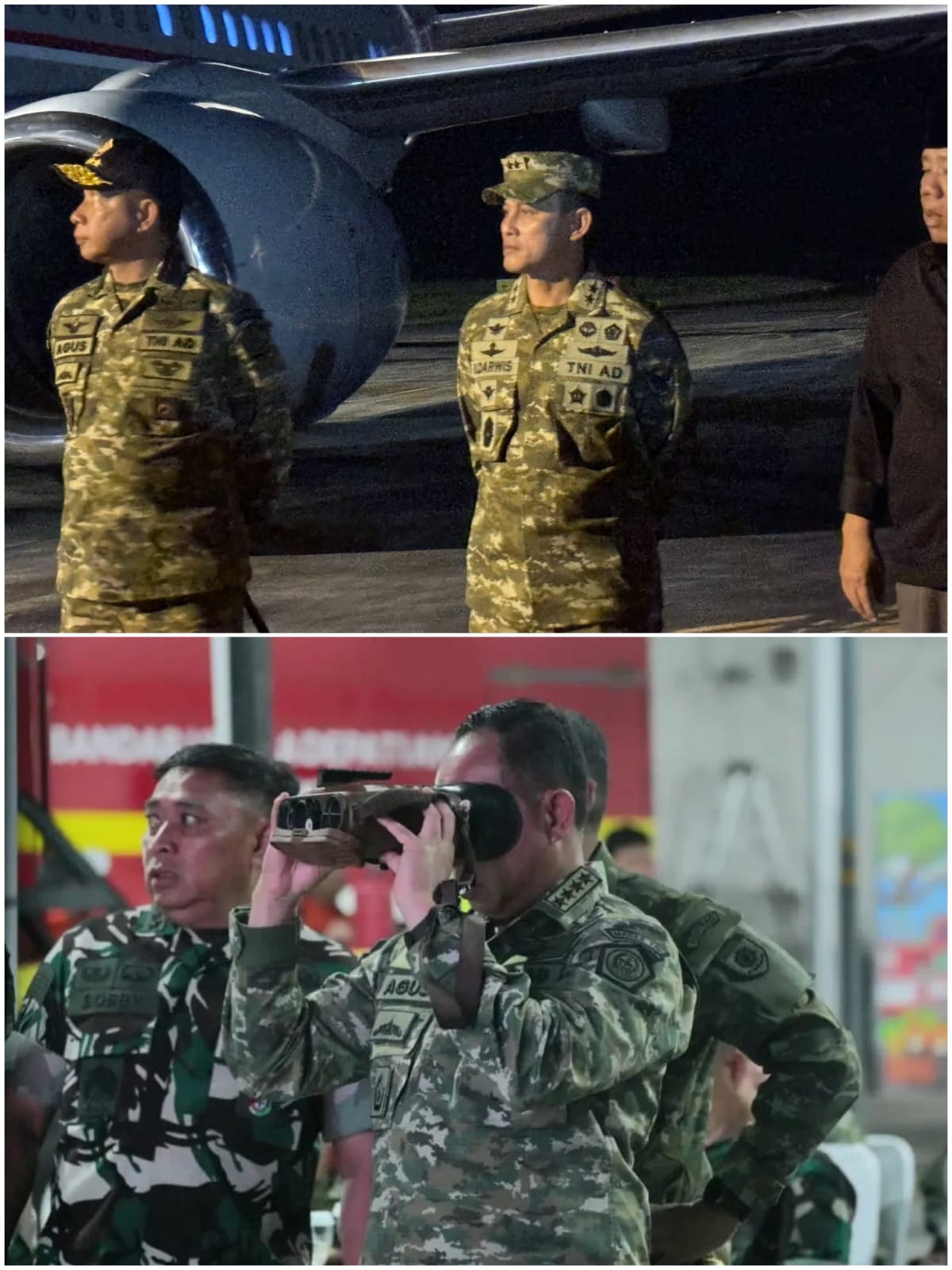 Pangdam II/Sriwijaya Mayjen TNI Ujang Darwis, M.D.A., mendampingi Panglima TNI Jenderal TNI Agus Subiyanto, S.E., M.Si., menyaksikan secara langsung latihan penerjunan malam Kelompok Depan Operasi Lintas Udara (KDOL) di Bandara Depati Amir, Pangkal Pinang, Selasa (18/11/2025) malam. Latihan ini menitikberatkan pada peningkatan kesiapan operasional prajurit dalam kondisi minim cahaya.