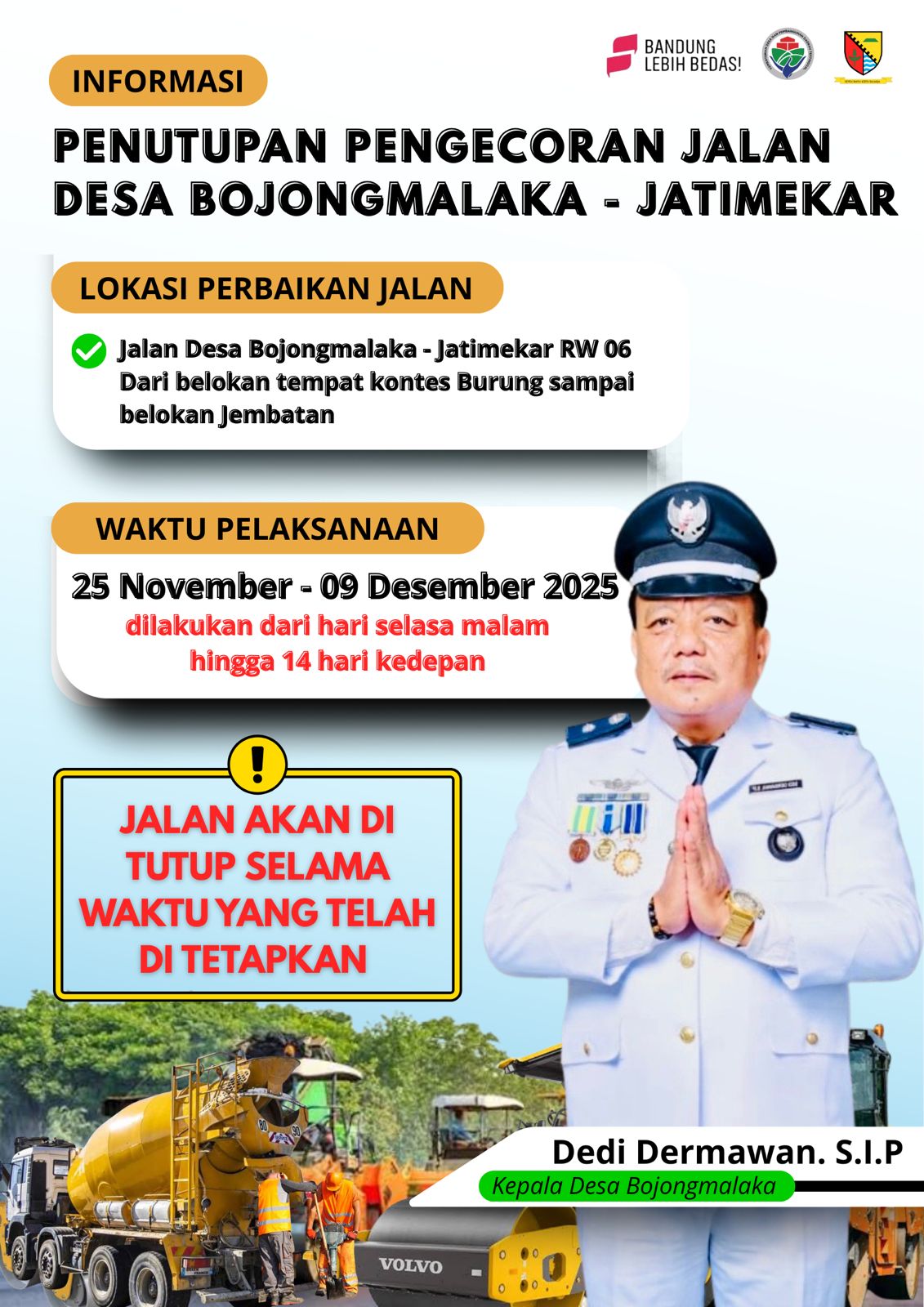 Pengecoran jalan Kp. jatimekar, RW, 06 Desa Bojongmalaka, Kab. Bandung Bantuan dana dari PUPR Kab. Bdg. dikerjakan, tgl, 25 Nopember 2025,yang berjalan dari pagi hari sampai larut malam, pengerjaan dengan baik dan lancar, yang di hadiri oleh Kepala desa, Ketua BPD, Bumdes, Babinsa, dan Babinmas dan tidak ketinggalan Kadus, stap desa RW dan para Ketua RT, dan tidak jetinggalan masyarakat pada jadir.