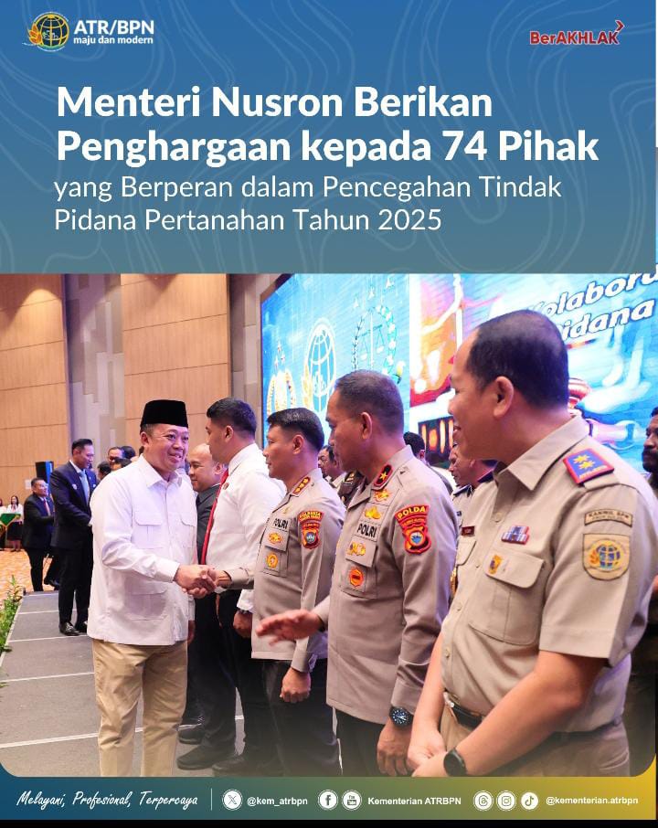 Pada Rapat Koordinasi (Rakor) Pencegahan dan Penyelesaian Tindak Pidana Pertanahan Tahun 2025, Menteri Agraria dan Tata Ruang/Kepala Badan Pertanahan Nasional (ATR/BPN), Nusron Wahid, menyematkan pin emas dan memberikan piagam penghargaan kepada pihak yang berperan dalam pencegahan serta penyelesaian tindak pidana pertanahan. Apresiasi ini diberikan kepada 74 pihak yang terdiri dari jajaran Kementerian ATR/BPN, Kepolisian, dan Kejaksaan dari 21 provinsi di Indonesia.