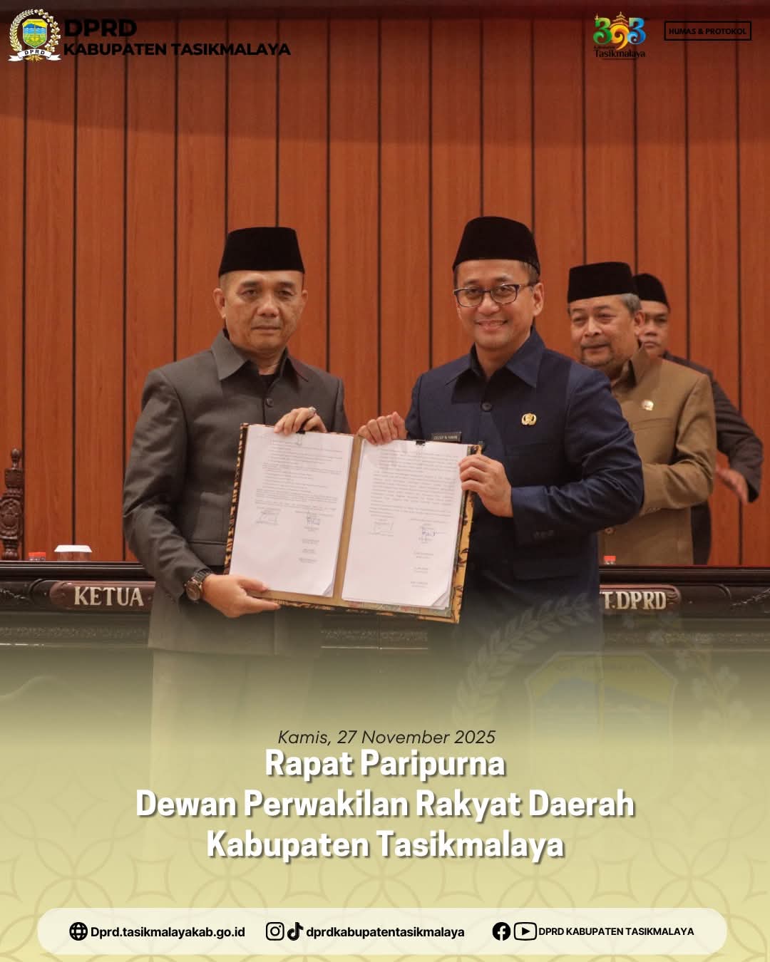 DPRD Kabupaten Tasikmalaya menggelar Rapat Paripurna dengan agenda penetapan tiga Rancangan Peraturan Daerah (Ranperda) serta Program Pembentukan Peraturan Daerah (Propemperda). Rapat dipimpin oleh Wakil Ketua DPRD Kabupaten Tasikmalaya, H. Aef Syaripudin, S.H., M.H.
