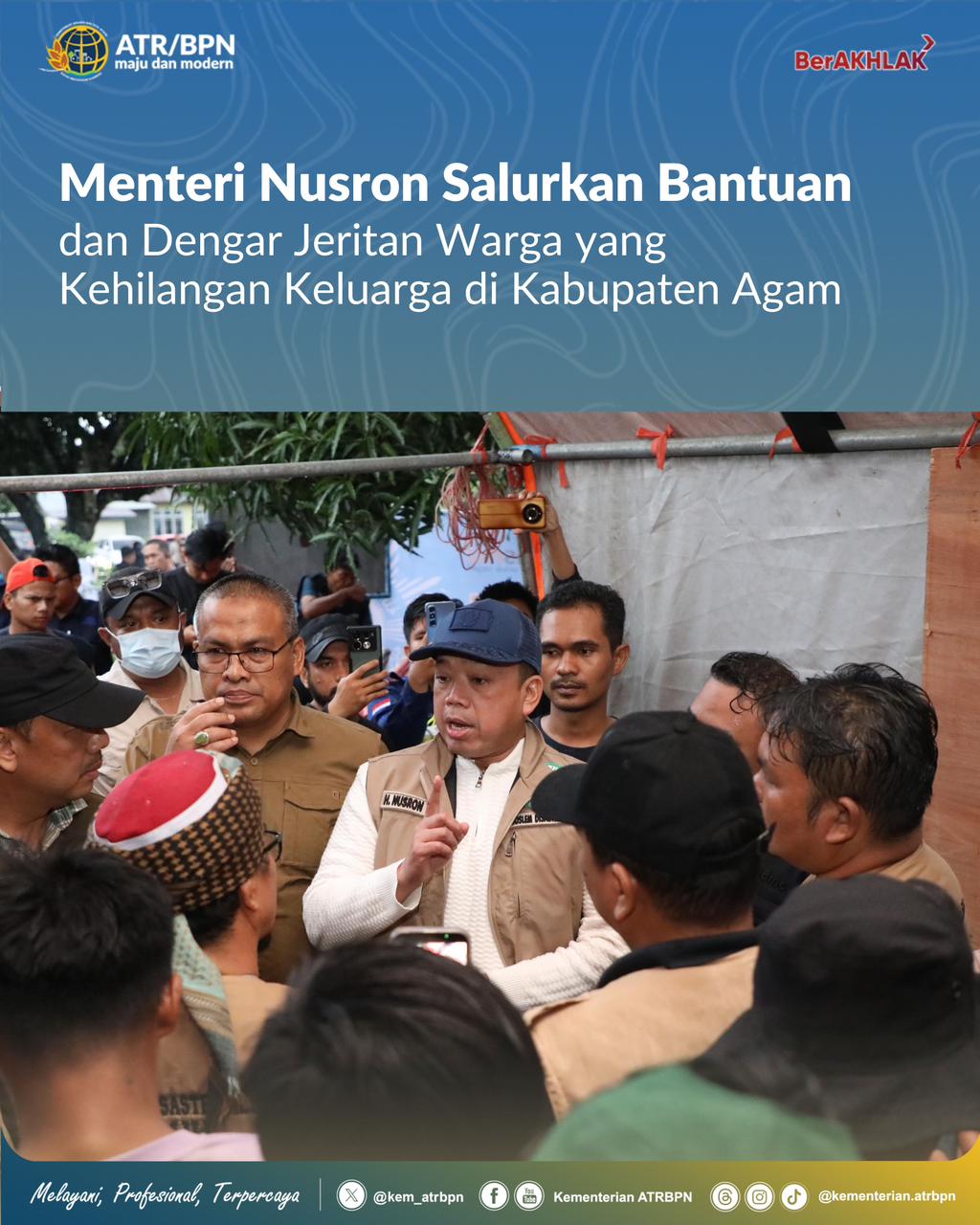Kementerian Agraria dan Tata Ruang/Badan Pertanahan Nasional (ATR/BPN) menunjukkan kepedulian nyata terhadap masyarakat terdampak banjir bandang atau galodo melalui program ATR/BPN Peduli Bencana. Menteri ATR/Kepala BPN, Nusron Wahid, bersama Wakil Ketua Umum Majelis Ulama Indonesia (MUI) KH Marsudi Syuhud dan Kepala Kantor Wilayah BPN Provinsi Sumatera Barat, Teddi Guspriadi, menyalurkan langsung bantuan kemanusiaan kepada warga di Nagari Salareh Aia, Kecamatan Palembayan, Kabupaten Agam, Provinsi Sumatera Barat, pada Sabtu (06/12/2025).