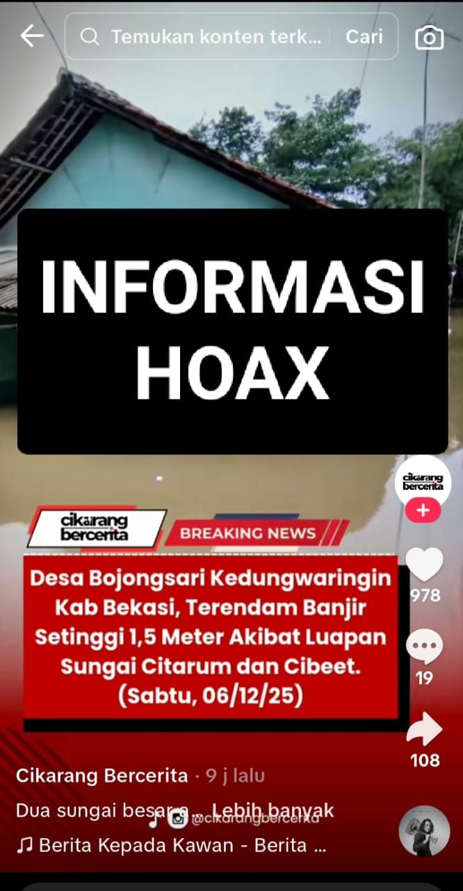 Pada tanggal 6 pagi Warganet di hebohkan dengan beredarnya video banjir yang berlokasi di Desa Bojong sari Kedung Waringin, kabupaten bekasi, dan ketika di survey oleh awak media lokasi surut warga menjalankan rutinitas seperti biasanya,,di harapkan video yg beredar di Medsos kalangan tiktok harus menyaring kebenaran informasi nya,jangan sampai seperti akun Tiktoker Cikarang bercerita,pas di cek ke lokasi oleh awak media ternyata HOAX atau informasi bohong.