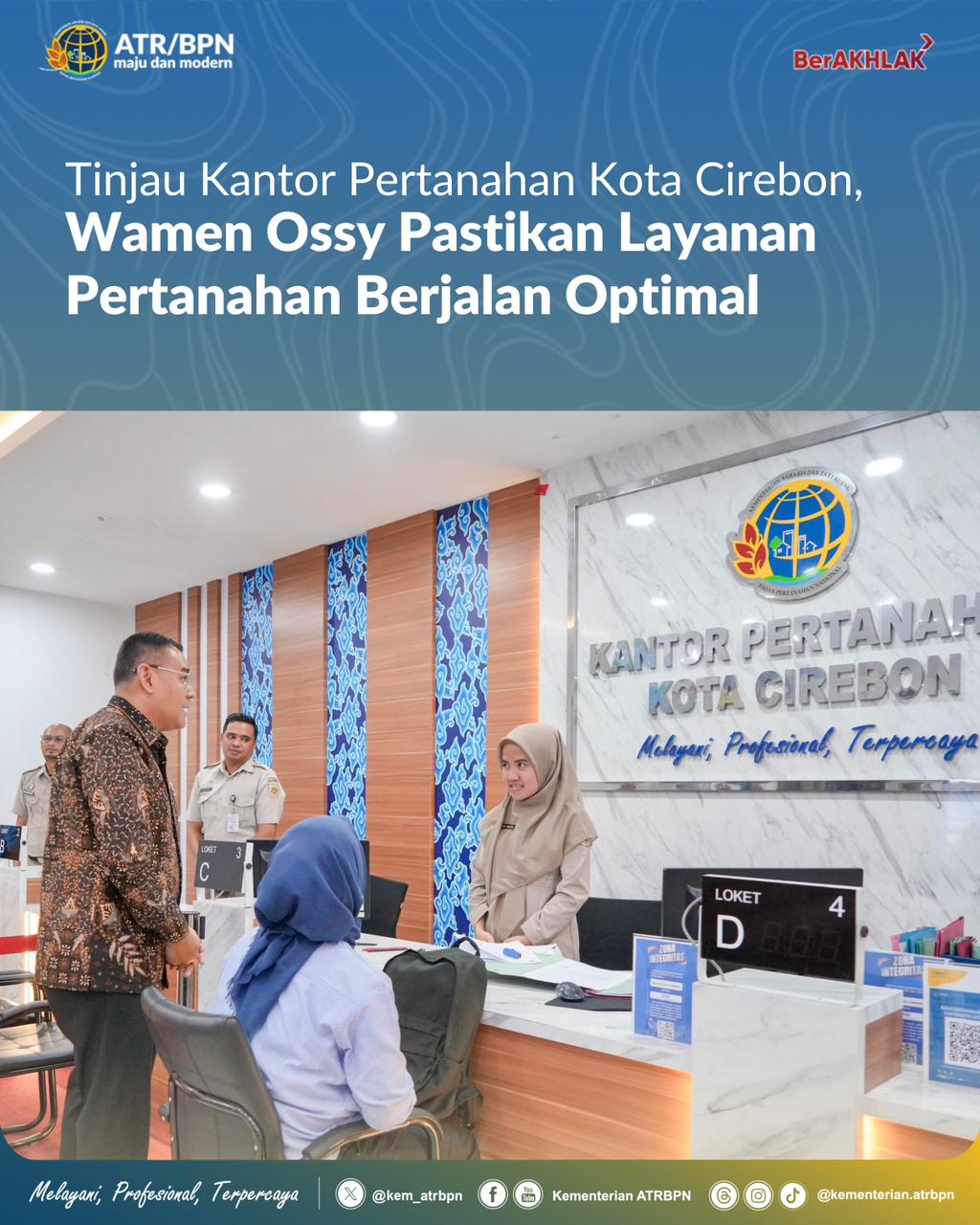Wakil Menteri Agraria dan Tata Ruang/Wakil Kepala Badan Pertanahan Nasional (ATR/Waka BPN), Ossy Dermawan, melakukan kunjungan kerja dan peninjauan langsung ke Kantor Pertanahan (Kantah) Kota Cirebon pada Selasa (16/11/2025). Peninjauan dilakukan untuk memastikan kualitas pelayanan pertanahan berjalan optimal serta selaras dengan kebijakan peningkatan layanan publik di lingkungan Kementerian ATR/BPN.