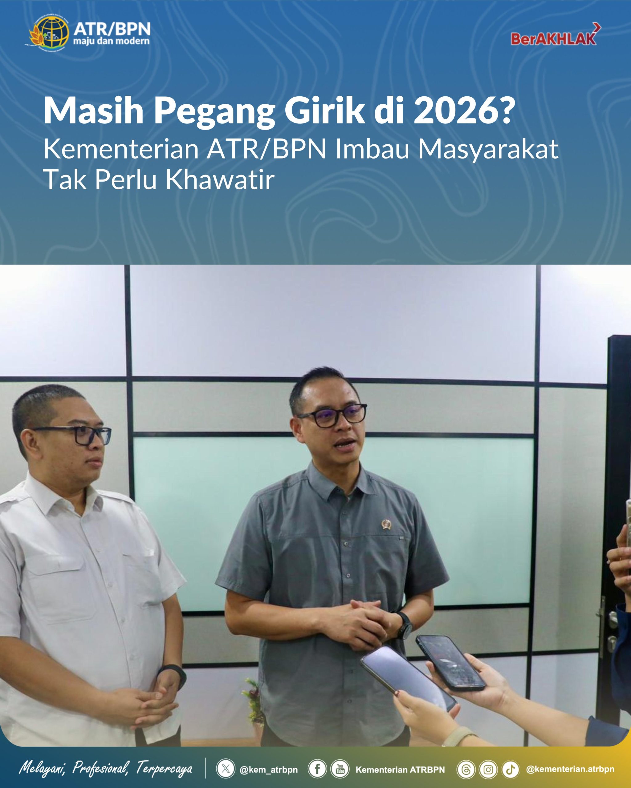 “Masyarakat yang sampai hari ini masih memiliki girik tidak perlu khawatir atau termakan informasi-informasi yang tidak bertanggung jawab. Apabila tanahnya ditempati, dikuasai, tetap dapat dimohonkan sertipikat tanahnya melalui kantor pertanahan,” kata Kepala Biro Hubungan Masyarakat dan Protokol Kementerian ATR/BPN, Shamy Ardian.