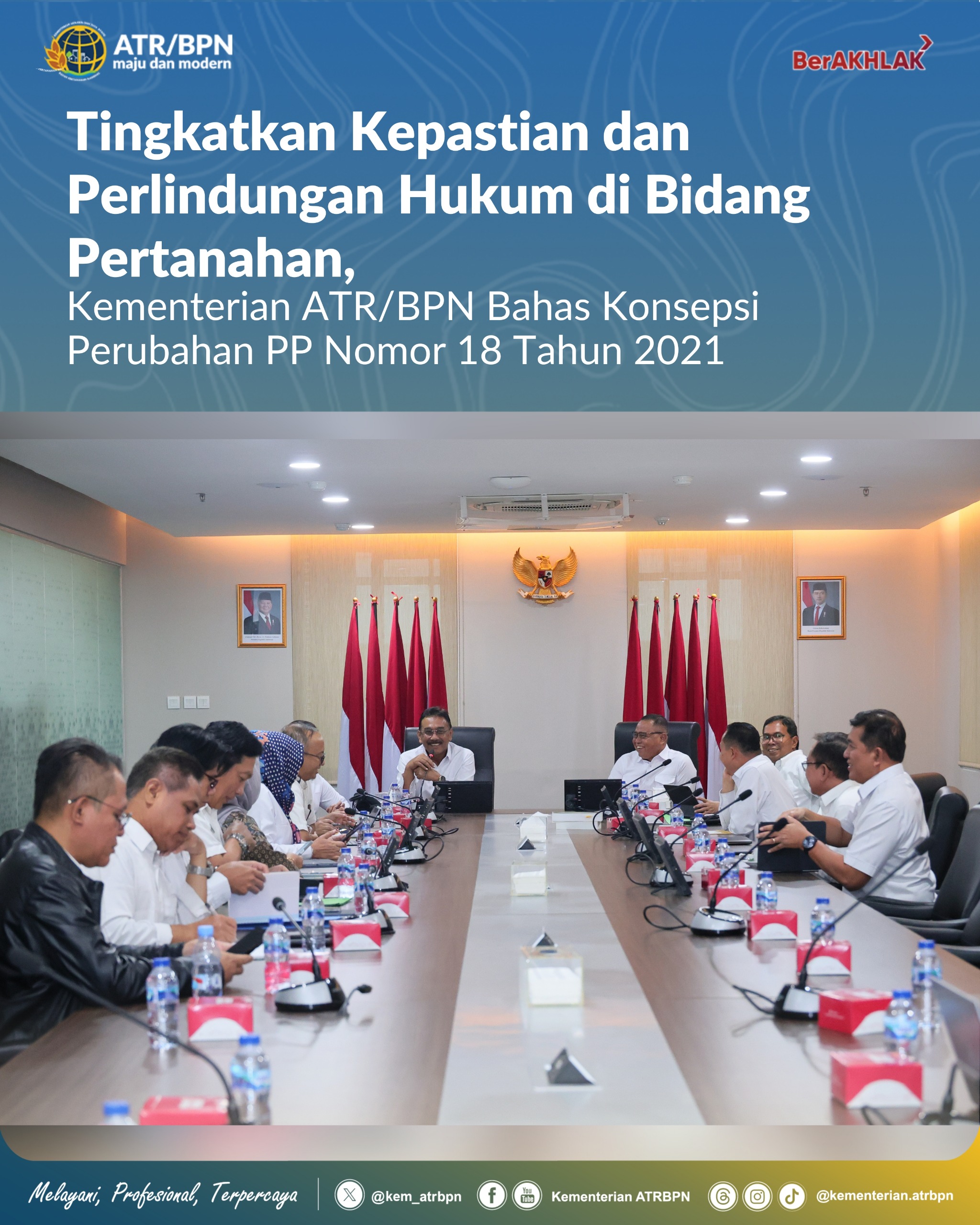 Kementerian Agraria dan Tata Ruang/Badan Pertanahan Nasional (ATR/BPN) menggelar Pembahasan Konsepsi Perubahan Peraturan Pemerintah (PP) Nomor 18 Tahun 2021 tentang Hak Pengelolaan, Hak Atas Tanah, Satuan Rumah Susun, dan Pendaftaran Tanah. Kegiatan tersebut berlangsung pada Rabu (07/11/2026) di Ruang Rapat 401 Kementerian ATR/BPN, Jakarta. Pembahasan ini bertujuan untuk meningkatkan kepastian serta perlindungan hukum di bidang pertanahan.