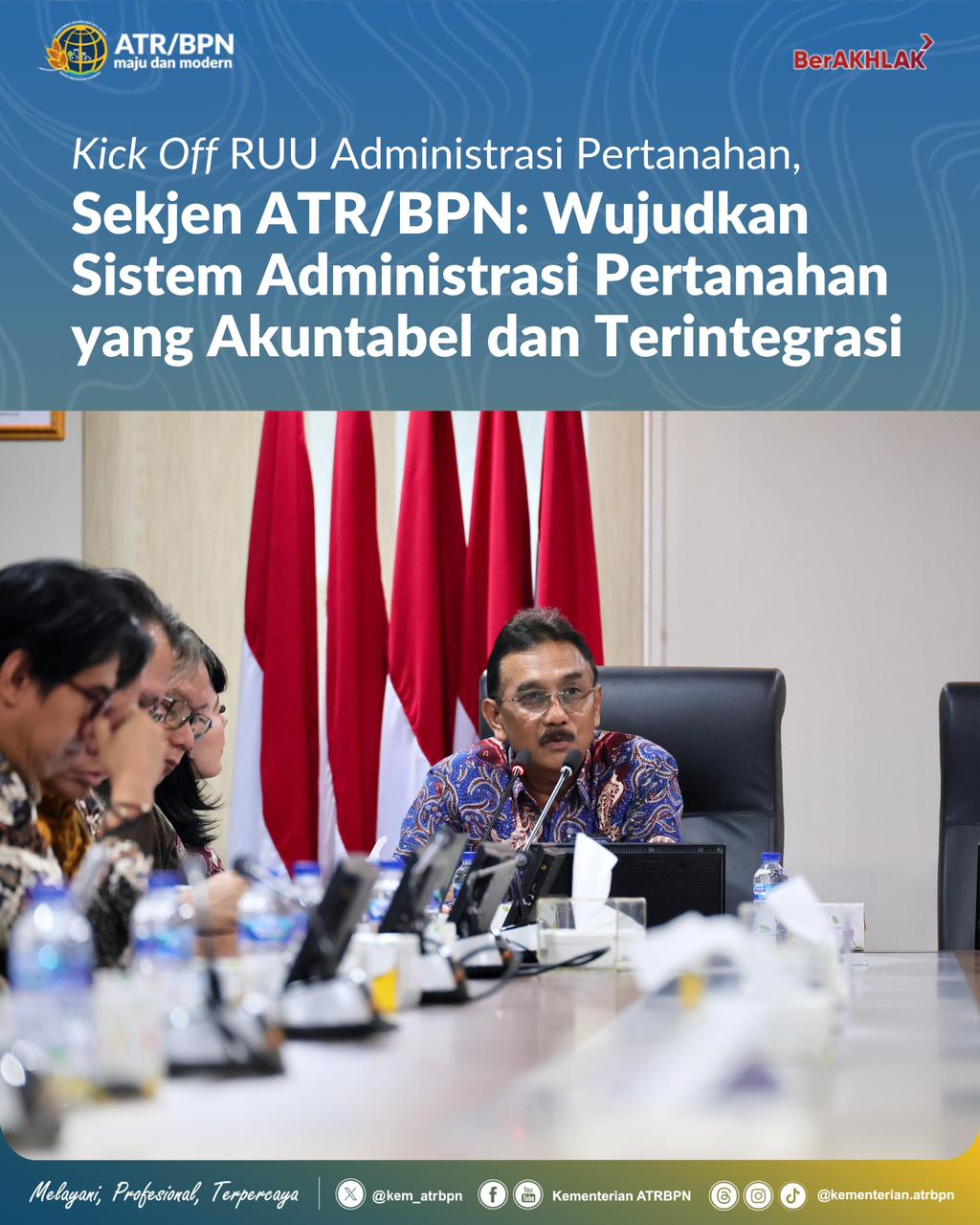 Kementerian Agraria dan Tata Ruang/Badan Pertanahan Nasional (ATR/BPN) menggelar _Kick Off Meeting_ Penyusunan Rencana Aksi Rancangan Undang-Undang (RUU) tentang Administrasi Pertanahan pada Jumat (09/01/2026). Kegiatan yang berlangsung di Ruang Rapat 401, Kementerian ATR/BPN, Jakarta ini merupakan tindak lanjut atas RUU Administrasi Pertanahan yang telah diputuskan dalam rapat paripurna tingkat I Dewan Perwakilan Rakyat Republik Indonesia (DPR RI), sebagai upaya mendorong penyelesaian berbagai persoalan di bidang pertanahan.