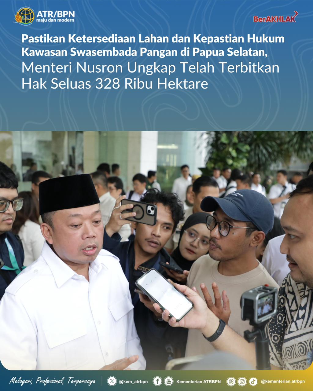 Menteri Agraria dan Tata Ruang/Kepala Badan Pertanahan Nasional (ATR/BPN), Nusron Wahid, memastikan ketersediaan lahan sekaligus kepastian hukum hak atas tanah bagi pengembangan Kawasan Swasembada Pangan, Energi, dan Air Nasional di Provinsi Papua Selatan. Kepastian tersebut ditunjukkan melalui penerbitan Surat Keputusan (SK) Hak Guna Bangunan (HGB) dan Hak Guna Usaha (HGU) seluas kurang lebih 328 ribu hektare yang telah dilakukan Kementerian ATR/BPN.