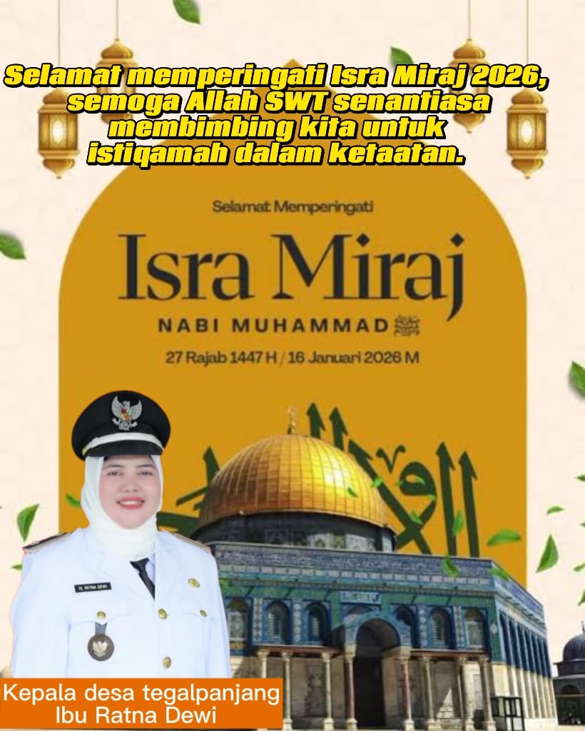”Saya atas nama pribadi dan Pemerintah Desa Tegalpanjang mengucapkan Selamat Hari Isra Mi’raj 1447 H. Mari kita jadikan peringatan ini sebagai momentum untuk meningkatkan disiplin dalam ibadah dan mempererat tali silaturahmi antarwarga,” ujar Ratna Dewi.