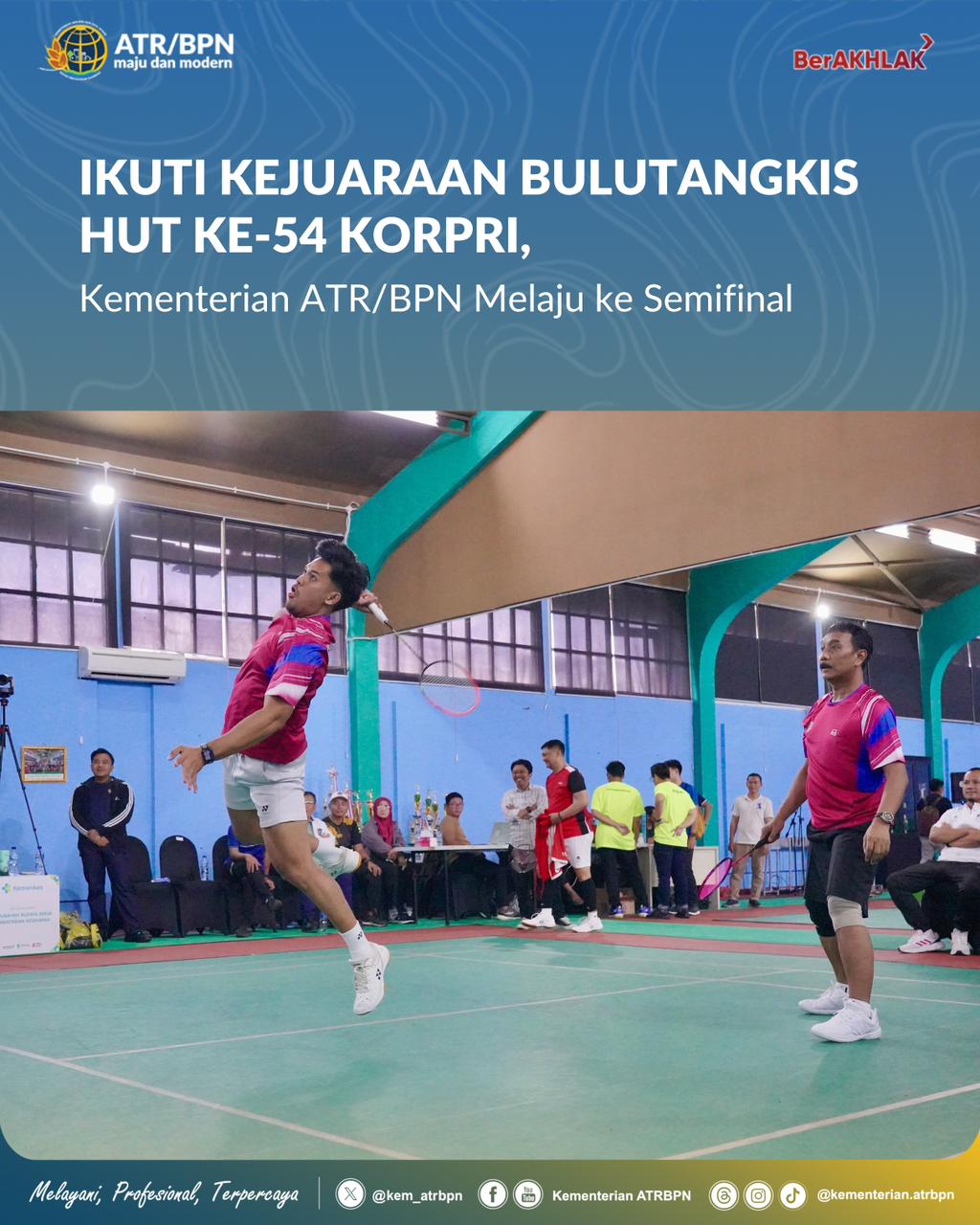 Kementerian Agraria dan Tata Ruang/Badan Pertanahan Nasional (ATR/BPN) turut berpartisipasi dalam Kejuaraan Bulutangkis Hari Ulang Tahun (HUT) ke-54 Korps Pegawai Republik Indonesia (KORPRI) yang diselenggarakan di Gelanggang Olahraga (GOR) Kementerian Kesehatan Republik Indonesia, Jakarta, Jumat (16/01/2026). Pada kategori Ganda Putra Eksekutif, Kementerian ATR/BPN berhasil menyingkirkan para pesaingnya di babak 16 besar dan perempat final, sehingga melaju ke babak semifinal yang akan digelar pada Minggu (18/01/2026).