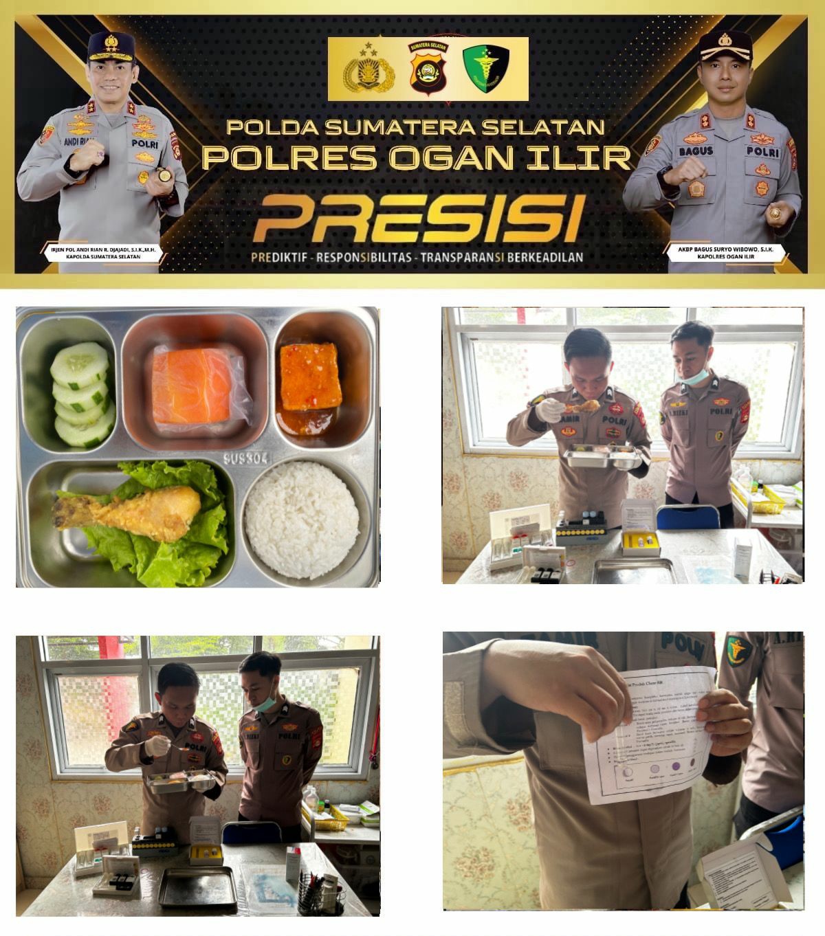 Kegiatan pemeriksaan berlangsung sejak pukul 07.00 WIB hingga selesai di Klinik Polres Ogan Ilir. Pemeriksaan dilakukan menggunakan metode organoleptik dan kimiawi sebagai bagian dari komitmen Polri dalam menjamin mutu serta keamanan makanan sebelum disalurkan kepada masyarakat.
