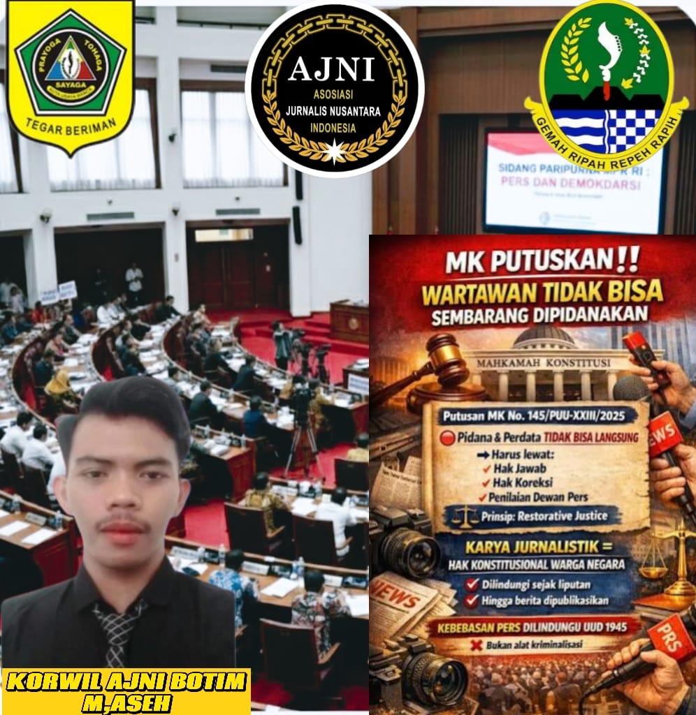 Ketua Koordinator Wilayah (Korwil) Bogor Timur Asosiasi Jurnalis Nusantara Indonesia (AJNI), M. Aseh, memberikan apresiasi setinggi-tingginya terhadap putusan terbaru Mahkamah Konstitusi (MK) terkait penguatan kemerdekaan pers yang diketuk pada Januari 2026. Putusan ini dinilai sebagai angin segar bagi para pencari berita di seluruh pelosok negeri.