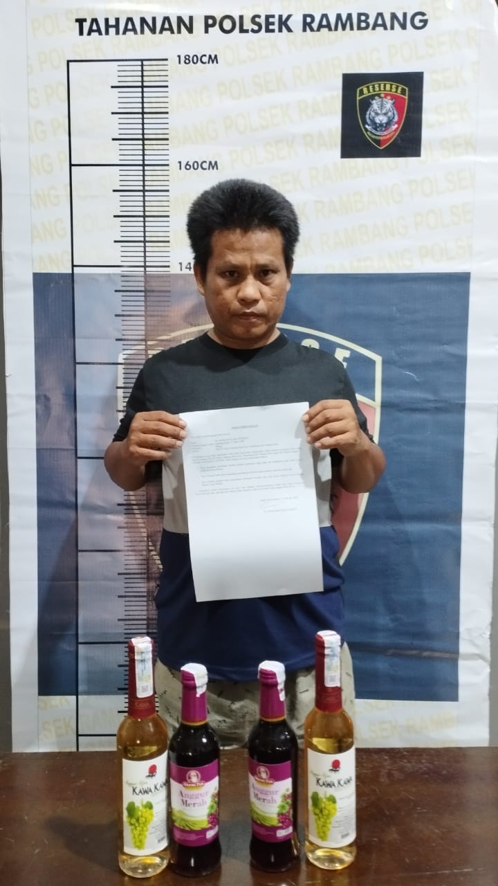 Dari lokasi tersebut, petugas mengamankan satu orang penjual beserta bukti barang berupa minuman keras tanpa izin sebanyak 2 botol jenis Anggur Merah dan 2 botol minuman keras jenis Kawa-kawa.