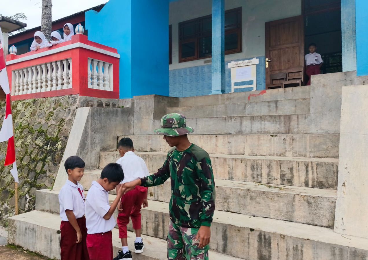 Sebagai wujud kepedulian Satgas TMMD Reguler ke-127 Kodim 0728/Wonogiri dalam meningkatkan semangat dan kerajinan anak-anak Desa Kembang untuk pergi menuntut ilmu di sekolah, Personel Satgas TMMD menjemput dikediamannya masing-masing dan mengantar anak-anak hingga menuju depan gerbang SD Negeri 1 Kembang, Desa Kembang, Kec Jatipurno, Kab Wonogiri, Selasa (24/2/2026).