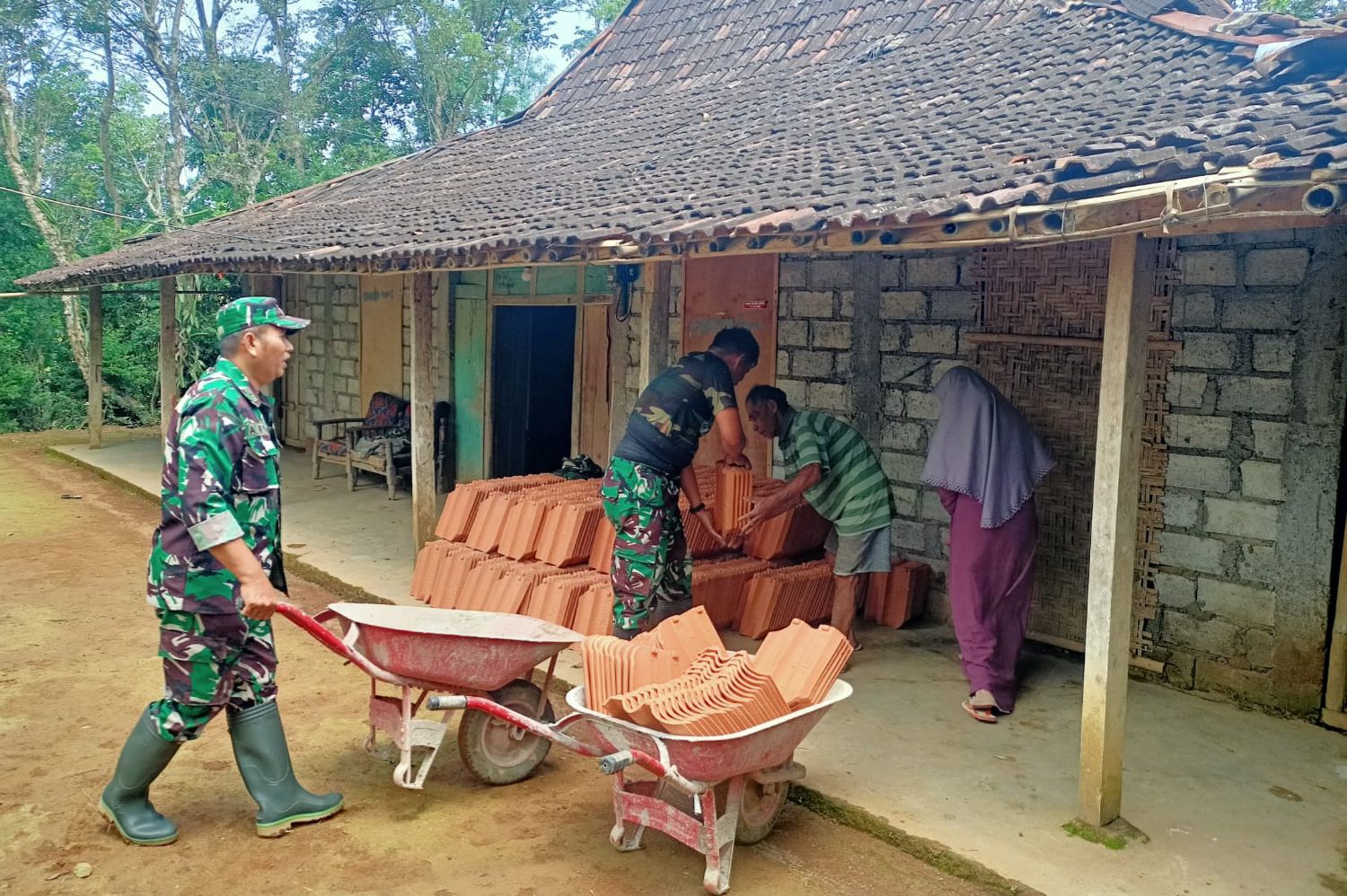 Material genteng mulai didatangkan ke lokasi, dan proses bongkar muat dilakukan secara gotong royong oleh personel Satgas TMMD bersama masyarakat menggunakan angkong.