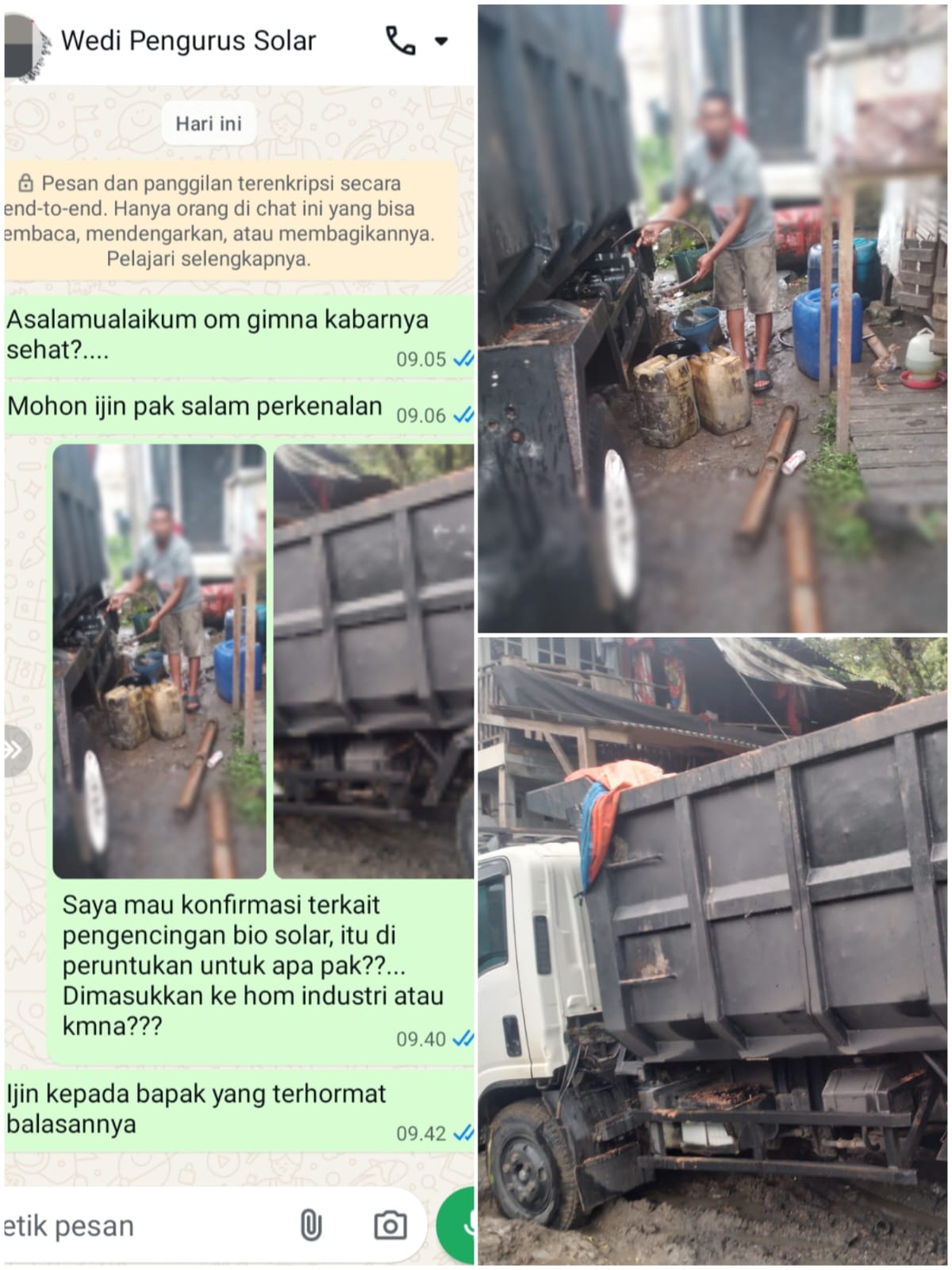 Wedi yang di duga selaku pengurus penimbunan BBM Bersubsidi bio Solar tersebut, ketika di konfirmasi via Watsapp tidak mau menjawab, kami selaku awak media pun menanyakan terkait Solar itu di peruntukan untuk apa. Wedi cuman Read doang seakan bungkam.