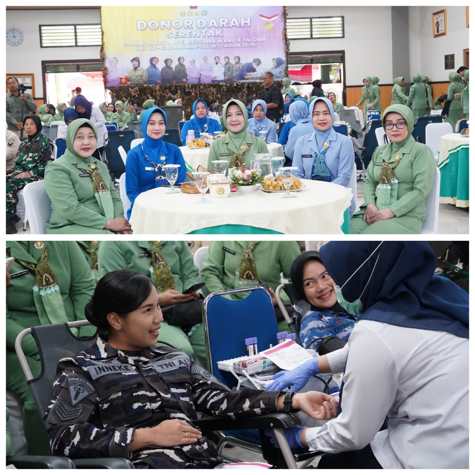 Dalam rangka memperingati Hari Ulang Tahun (HUT) Ke-62 Dharma Pertiwi sekaligus dalam rangka Apel Bersama Wanita TNI Tahun 2026, Ketua Dharma Pertiwi Daerah B, Ny. Desi Ujang Darwis menghadiri dan meninjau langsung kegiatan Bakti Sosial Donor Darah, pada Kamis (02/04/2026) bertempat di Aula Makesdam II/Sriwijaya BKB Palembang.