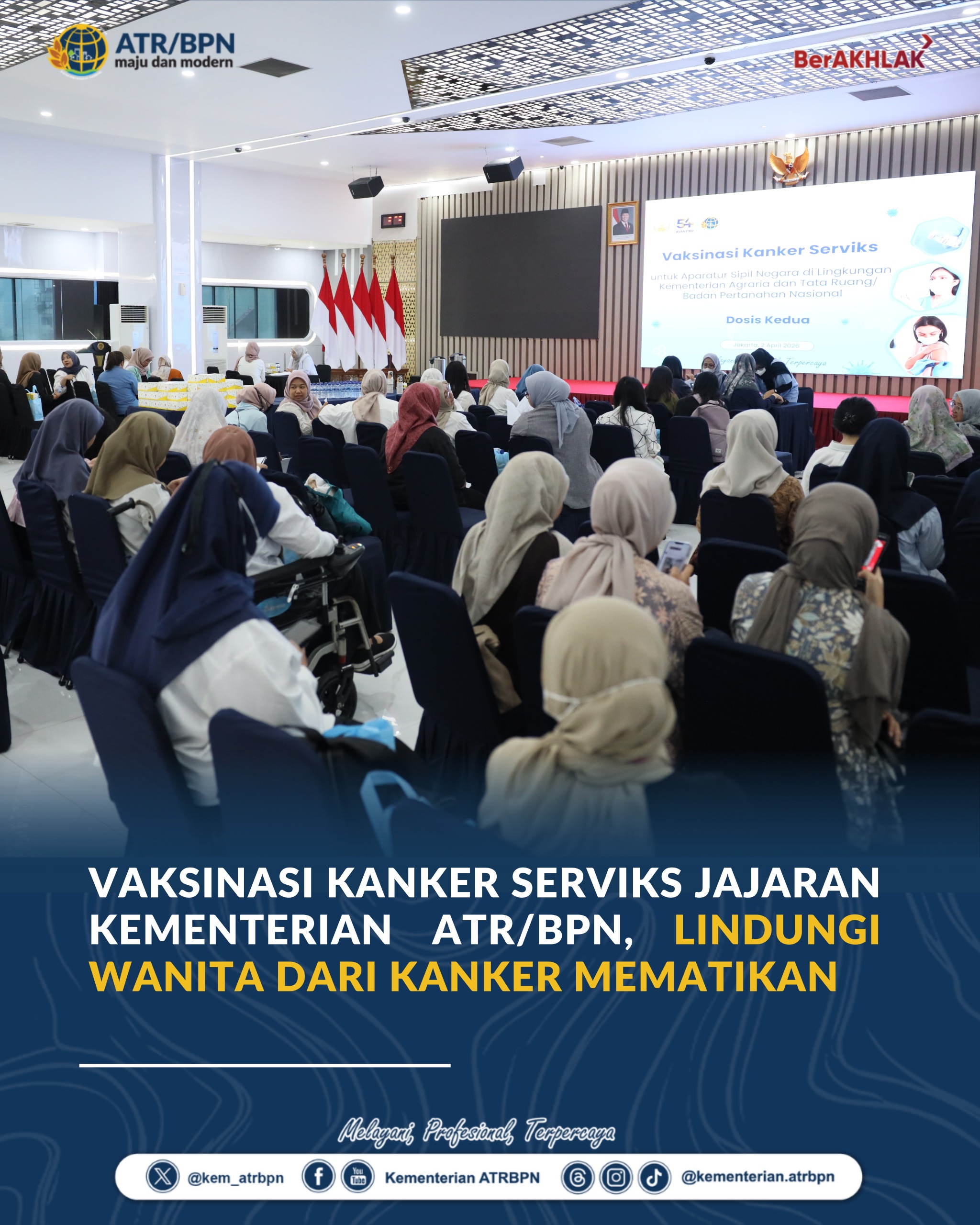 Kanker serviks adalah salah satu penyakit mematikan yang dapat menyerang perempuan. Untuk meningkatkan kesadaran sekaligus melindungi dari risiko terkena penyakit itu, Kementerian Agraria dan Tata Ruang/Badan Pertanahan Nasional (ATR/BPN) membuat program vaksinasi kanker serviks bagi jajarannya sejak awal 2026. Vaksinasi ini telah dinantikan oleh insan pertanahan di lingkungan Kementerian ATR/BPN.