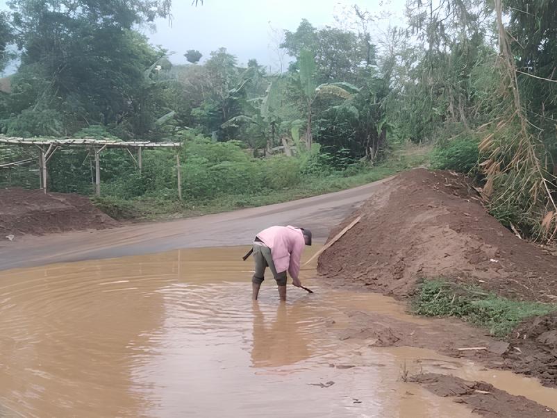 Dari hasil peninjauan di lapangan, ditemukan pula jalur irigasi di sekitar area kubangan yang tertimbun endapan lumpur. Akibatnya, aliran air tidak dapat mengalir ke hilir dan justru menggenang di badan jalan, sehingga memperburuk kondisi dan meningkatkan risiko bagi pengguna jalan.