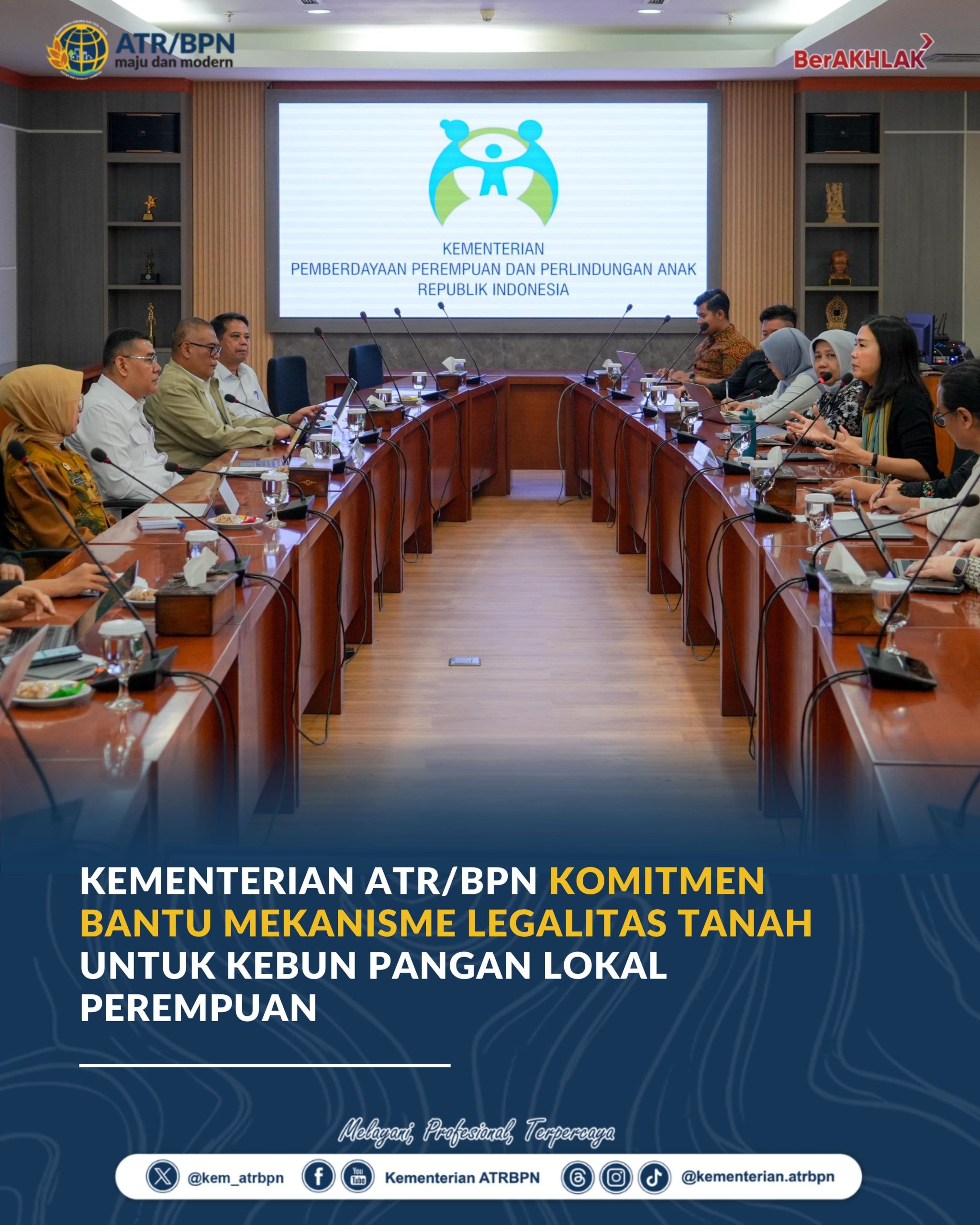 Wakil Menteri Agraria dan Tata Ruang/Wakil Kepala Badan Pertanahan Nasional (Wamen ATR/Waka BPN), Ossy Dermawan, menyatakan kesiapan Kementerian ATR/BPN untuk mendukung program Kebun Pangan Lokal Perempuan (KPLP) yang diinisiasi Kementerian Pemberdayaan Perempuan dan Perlindungan Anak (PPPA). Dukungan tersebut utamanya mencakup aspek perolehan serta legalisasi tanah yang akan digunakan sebagai lokasi _pilot project_ program KPLP.