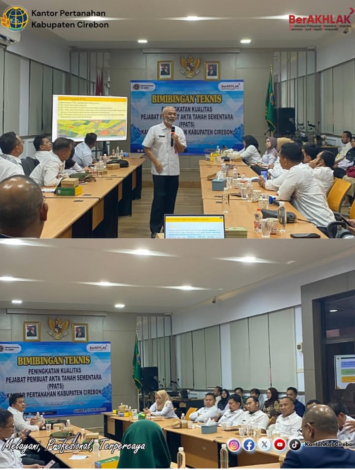 Kantor pertanahan kabupaten Cirebon melakukan bimbingan teknis kepada PPATS pejabat pembuat akta Tanah sementara Rabu (15/04) bertempat di aula kantor pertanahan kabupaten Cirebon, dalam kesempatan tersebut hadir para camat yang bertugas di wilayah kabupaten Cirebon, kegiatan ini bertujuan untuk memberikan pengetahuan terkait tugas fungsi PPAT ucap Hasan Mas’ud Safi’i selaku Kasubag tata usaha kantor pertanahan kabupaten Cirebon.