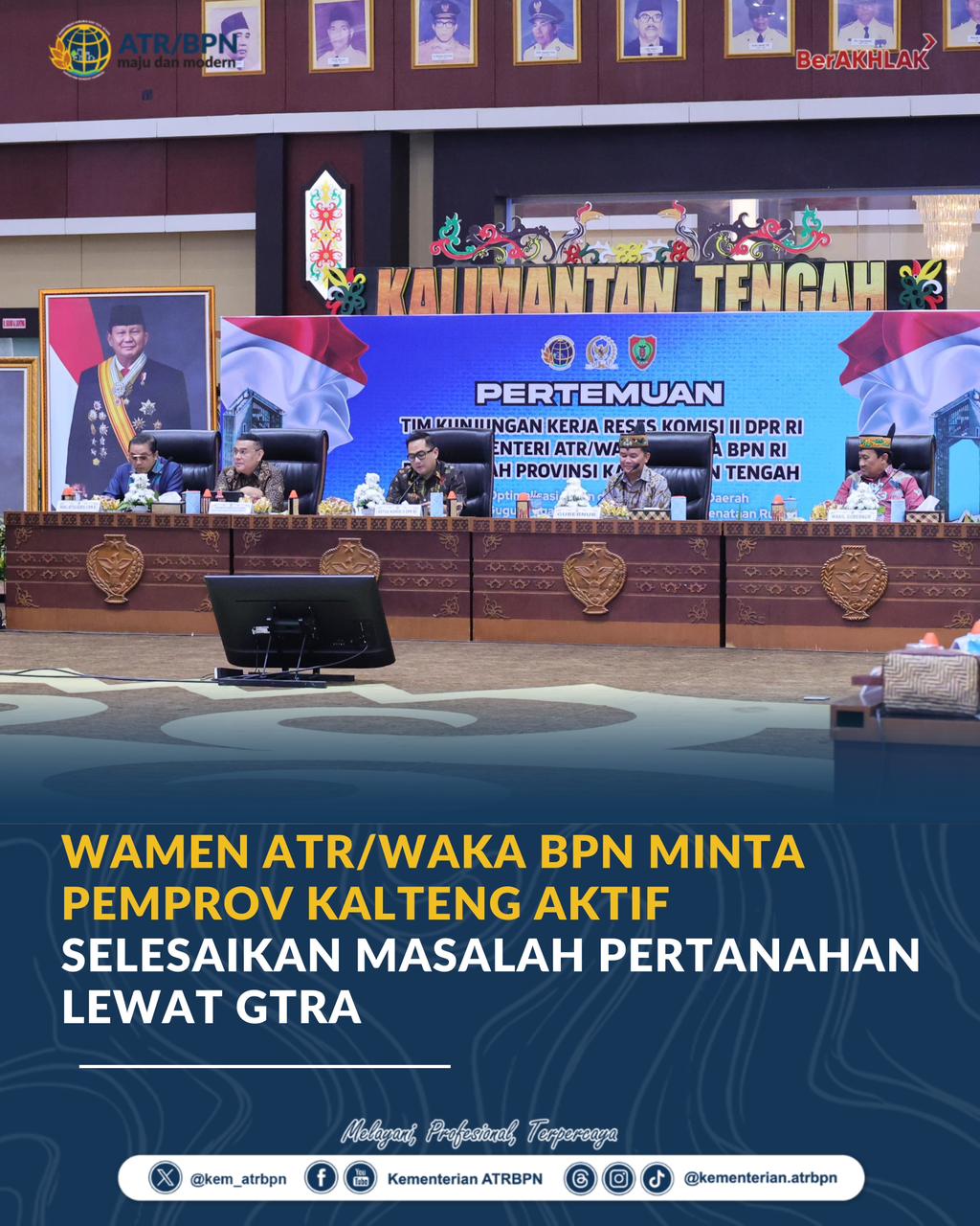 Palangkaraya pinews- Wakil Menteri Agraria dan Tata Ruang/Wakil Kepala Badan Pertanahan Nasional (Wamen ATR/Waka BPN), Ossy Dermawan, dalam Kunjungan Kerja Reses Komisi II DPR RI di Kalimantan Tengah (Kalteng), Kamis (23/04/2026), mengimbau pemerintah provinsi (Pemprov) untuk lebih aktif menyelesaikan masalah pertanahan. Langkah itu bisa dilakukan dengan memanfaatkan Gugus Tugas Reforma Agraria (GTRA).