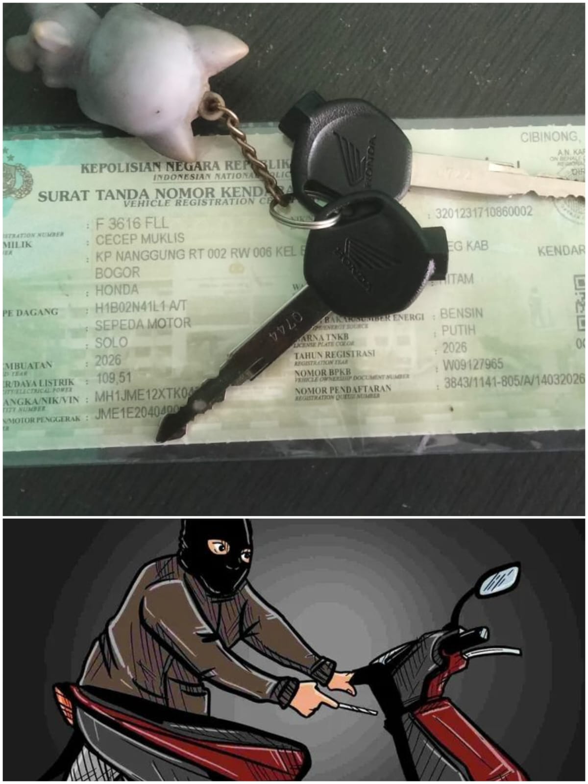 Korban pencurian, Cecep Muklis atau yang akrab disapa Bacoy Menerangkan, sepeda motor miliknya yang raib dicuri adalah jenis Honda Beat, warna hitam dengan nomor polisi F 3616 FLL