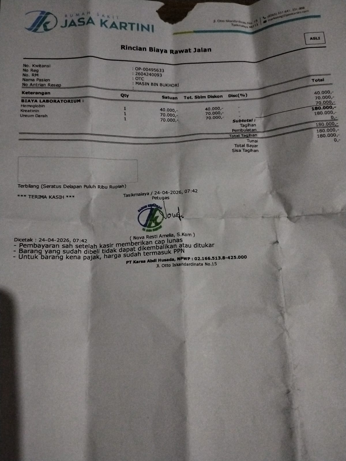 Berdasarkan bukti kuitansi yang beredar tertanggal 24 April 2026, pasien diminta membayar biaya sebesar Rp. 180.000,- untuk rincian pemeriksaan kesehatan