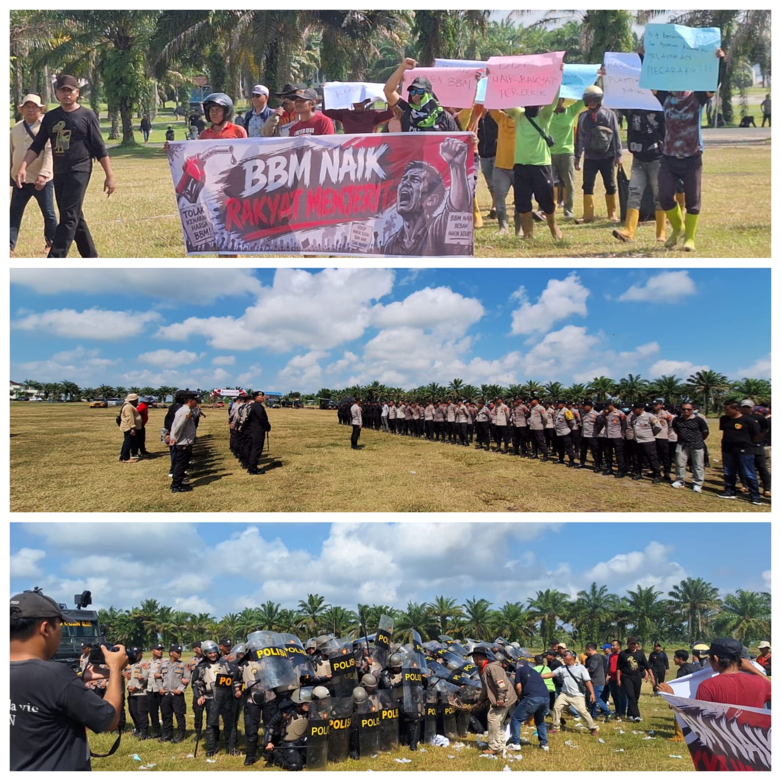 Ribuan massa yang tergabung dari elemen buruh dan sopir angkutan digambarkan melakukan aksi unjuk rasa yang awalnya berjalan kondusif, namun kemudian memanas akibat ketidakpuasan terhadap hasil mediasi. Situasi meningkat menjadi kericuhan dengan aksi pembakaran ban, dorong-mendorong, hingga pelemparan terhadap petugas.
